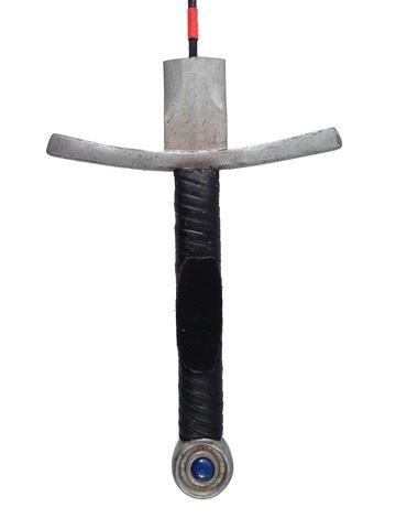 Death Dealer screen used, production distressed death dealer sword. The blade of the sword is for sfx. The sword handle has black leather grip and a piece of velcro on one side. The bottom of the handle has a round blue gemstone. (approx. 28" x 10")