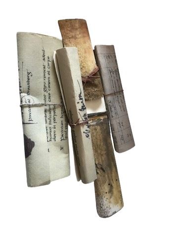 Great Hall thin rope tied paper scroll, 4 rolls in all. (approx. 13" long)