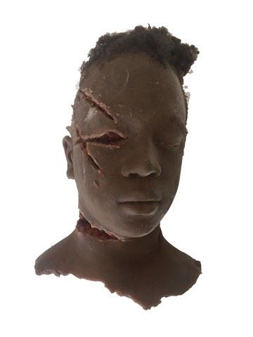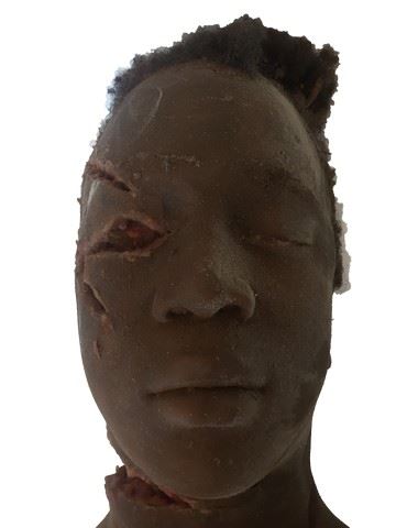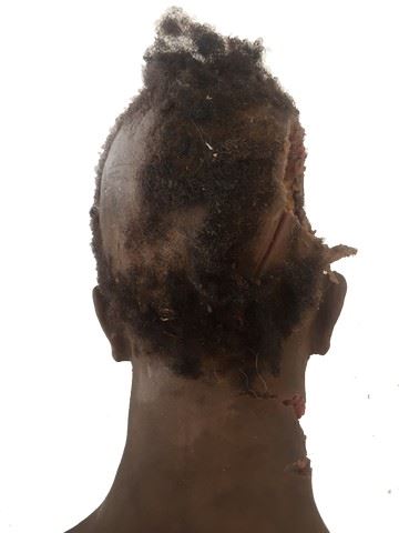 Slave's head made of latex and foam with realistic features, large wounds and bits of synthetic hair. (14"x12")