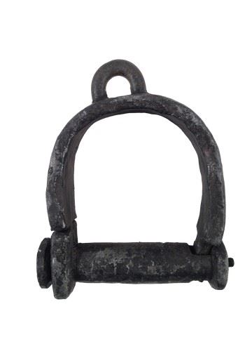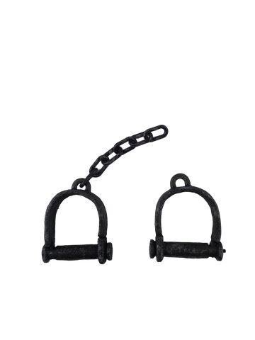 Screen used, production distressed slave shackle with chain attached to only one shackle. The shackles have a black rustic look and are made of hard plastic. (shackle approx. 5" x 4")