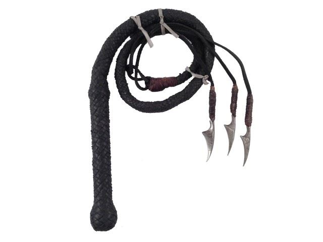 Screen used, production distressed leather braided whip with three metal blades at the end of the whip.