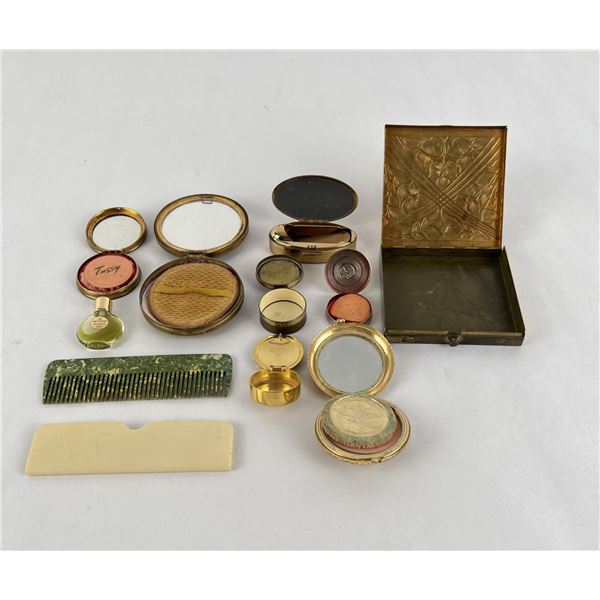 Lot includes bakelite comb and perfume bottle.