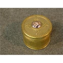 Une boîte en métal doré, le couvercle orné d'un médaillon émaillé représentant une jeune femme en...