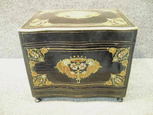 A Napoleon III period ebonized wood liquor cabinet with walnut, mother of pearl and brass inlays, containing 9 muslin glasses and four matching decanters.