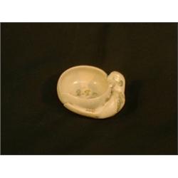 Une coupelle à décor émaillé de vert, en forme de pêche flanquée d'un perroquet dont le bec repose sur le rebord, (manque). A green enamelled bowl shaped as a peach with a parrot curled on its side with its beak resting on the rim, (loss). $100/150