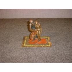 Une groupe en bronze de Vienne peint représentant un marchand d'esclave présentant une jeune femme que son bras articulé vêt et dévêt, sur un tapis multicolore, porte la marque de fonderie Bergman et la mention: "Austria". A Vienna cold painted bronze group of a slave merchant offering a maiden whom he covers or discovers with his articulated arm, bears the Bergman foundry mark and the mention: "Austria". $2000/2500
