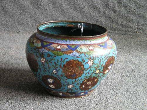 A late 19th Century Chinese cloisonne enamel oval planter decorated with gilt powdered medallions on a floral turquoise ground, (slight imperfection).