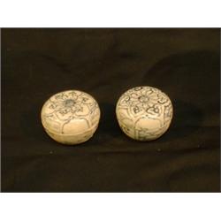 Une paire de boîtes couvertes en forme de melon, le couvercle décoré de fleurs d'où rayonnent six "ruyis", les côtés ornés de médaillons en forme de pétales de lotus renfermant des brindilles et un motif de vagues. A pair of melon shaped covered boxes, the lid decorated with a central floral medallion from which radiate six "ruyis", the side with lotus petal medallions filled with tendrils and a wave pattern. $250/350