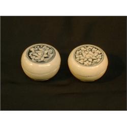 Une paire de boîtes globulaires couvertes, le couvercle orné de fleurs dans un encadrement de feuillage. A pair of globular covered boxes, the lid decorated with flowers framed by foliage. $250/350