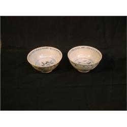 Une paire de bols à décor intérieur fleuri, l'extérieur orné d'un bandeau de fleurs et de feuilles au-dessus de motifs lotiformes. A pair of bowls, the inside decorated with flowers, the outside with a floral and foliate band above a lotus leaf frieze. $200/300