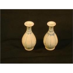 Une paire de petits vases à décor moulé de lobes peints de motifs bleu cobalt. A pair of pear shaped small bottles with trumpet necks and lobed moulded sides with a floral cobalt blue decoration. $150/250