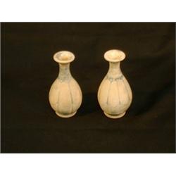 Une paire de petits vases à décor moulé de lobes peints de motifs bleu cobalt. A pair of pear shaped small bottles with trumpet necks and lobed moulded sides with a floral cobalt blue decoration. $150/250