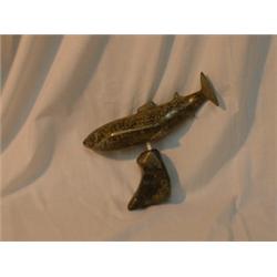 Une sculpture inuit en stéatite représentant un poisson sur un support. An Inuit stone carving of a fish, on stand. $150/200