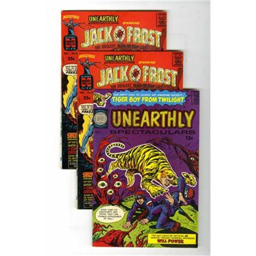 <B>Unearthly Spectaculars #1 and 2 Group (Harvey, 1965) Condition: Average VF-.</B></I> Includes #1 (Tiger Boy, Jack Sparling cover, not Joe Simon, as Overstreet states) and #2 (2 copies - Jack Q. Frost, Tiger Boy, and the Three Rocketeers appearances, Al Williamson, Wally Wood, and Gil Kane art). Approximate Overstreet value for group = $75. <I> From the Madison Monk Collection.</B></I><BR><BR><b>Shipping:</b> Comics - Unslabbed (<a target="_blank" href="http://www.heritageauctions.com/common/shipping.php">view shipping information</a>)