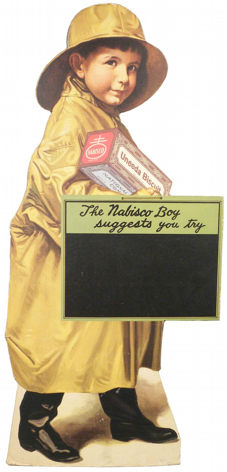 Uneeda Biscuit Boy Diecut Cardboard Easel Back Menu Sign. Very slight edge ware otherwise near mint condition. 14 1/2 X 31 inches.