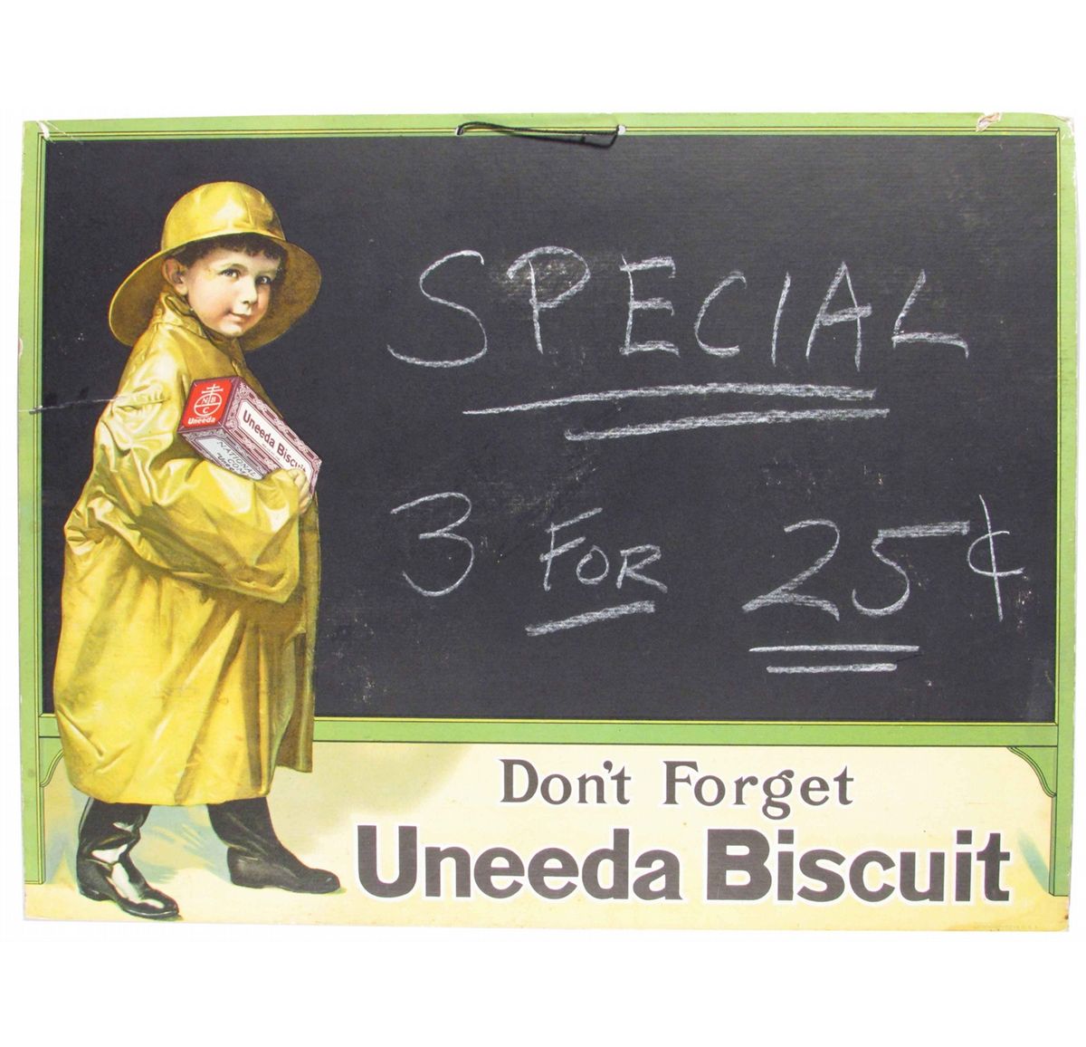 Uneeda Biscuit Cardboard "Black Board" String Hanging Sign. Crease at 11:00 and hole top right otherwise very good condition. 21 X 16 inches.