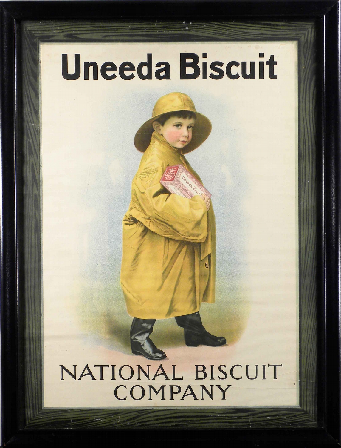 Uneeda Biscuit National Biscuit Company Paper Sign. Framed under glass. A couple of horizontal wrinkles at bottom and slight stains at top right otherwise very good condition. 17 X 23 inches image only.
