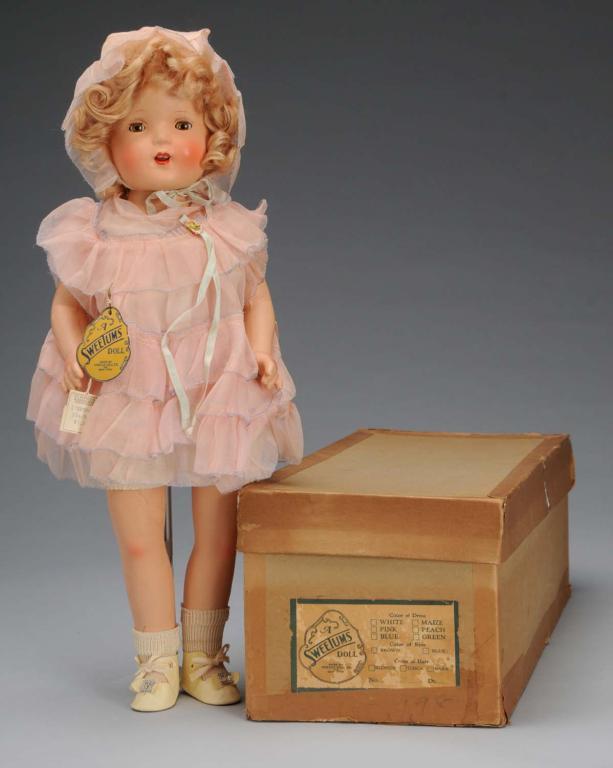 American, circa 1940s. Composition head, shoulder plate, arms and lower legs on cloth body. Beautiful coloring with original blonde mohair wig, lashed brown sleeping eyes, open mouth with two upper teeth, and rosy cheeks. Some lip wear, light crazing, and crack under nose. Wearing original pink taffeta dress with matching hat, undergarments, shoes and socks. Includes original Sweetums label, J.C. Penney price tag and original box. Condition (Very Good). Size 18" T.