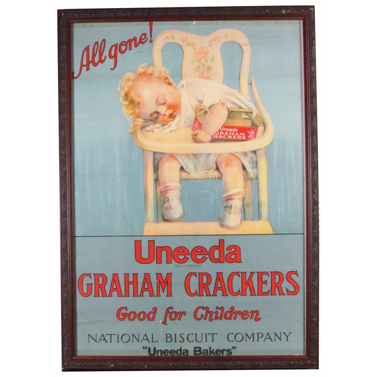 Uneeda Graham Crackers Paper Sign. Depicting little girl in high chair. Some fold creases and a tear at 6:00 otherwise good condition. Framed under glass. 13 1/2 X 20 inches image only.