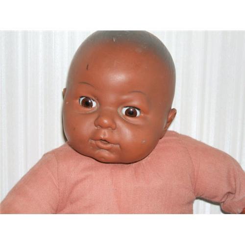 Uneeda doll with cloth body and molded painted hair and opening and closing eyes with black eyelashes. Doll is in Fair condition with some pen marks and one hand twisted. Very cute! U.D. Co. Int. marked on back of neck