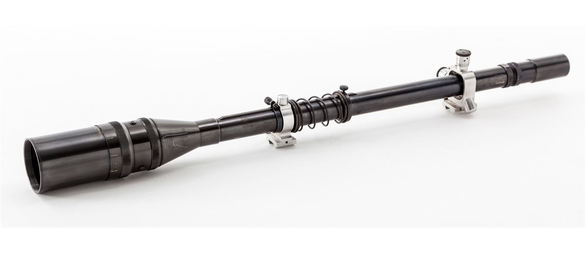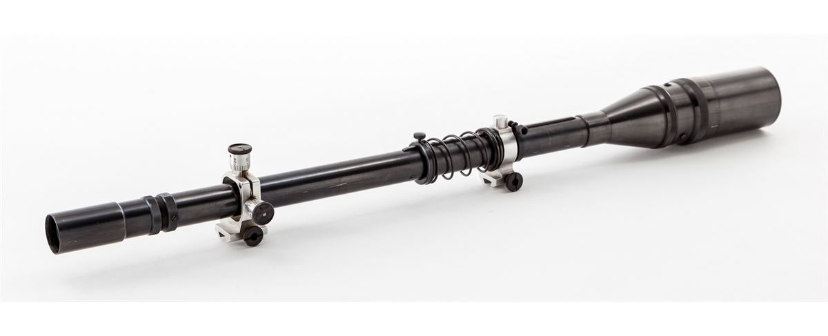 Unertl Programmer 200 Target Scope, 30-power, 1'' dia. tube, 26-1/2'' in length, weighing 45 ozs., with scope covers, and clear crosshair reticles. Condition is fine showing just light marks from handling, mostly as micro-scratching to various parts of tube, more pronounced at left side forward bell. Scope includes rings and recoil spring. Est.: $750-$1,000.