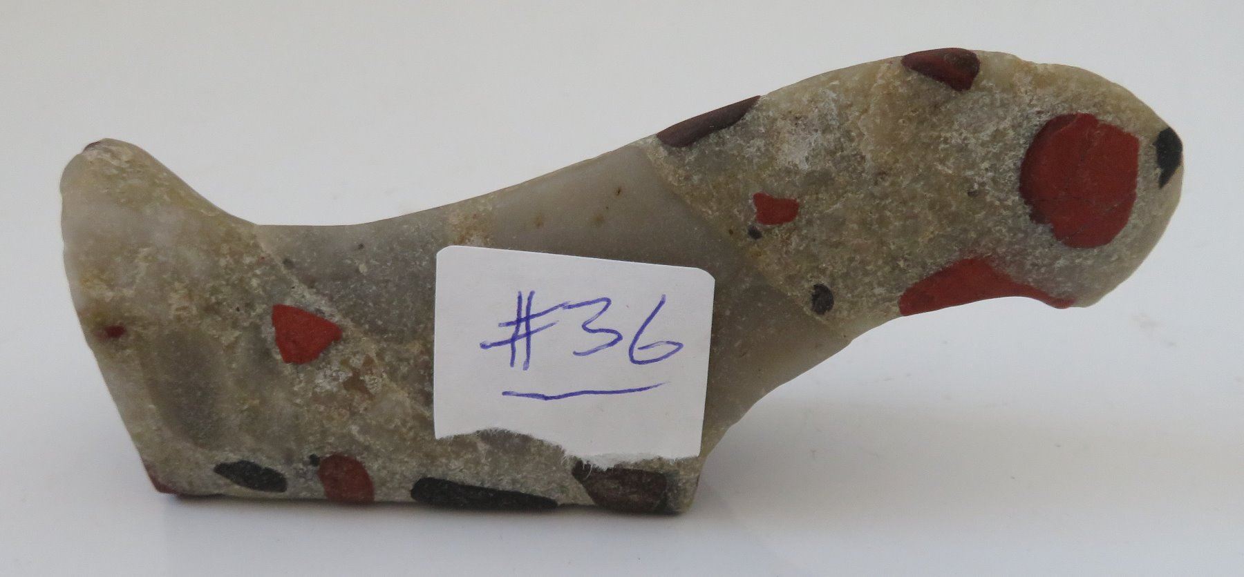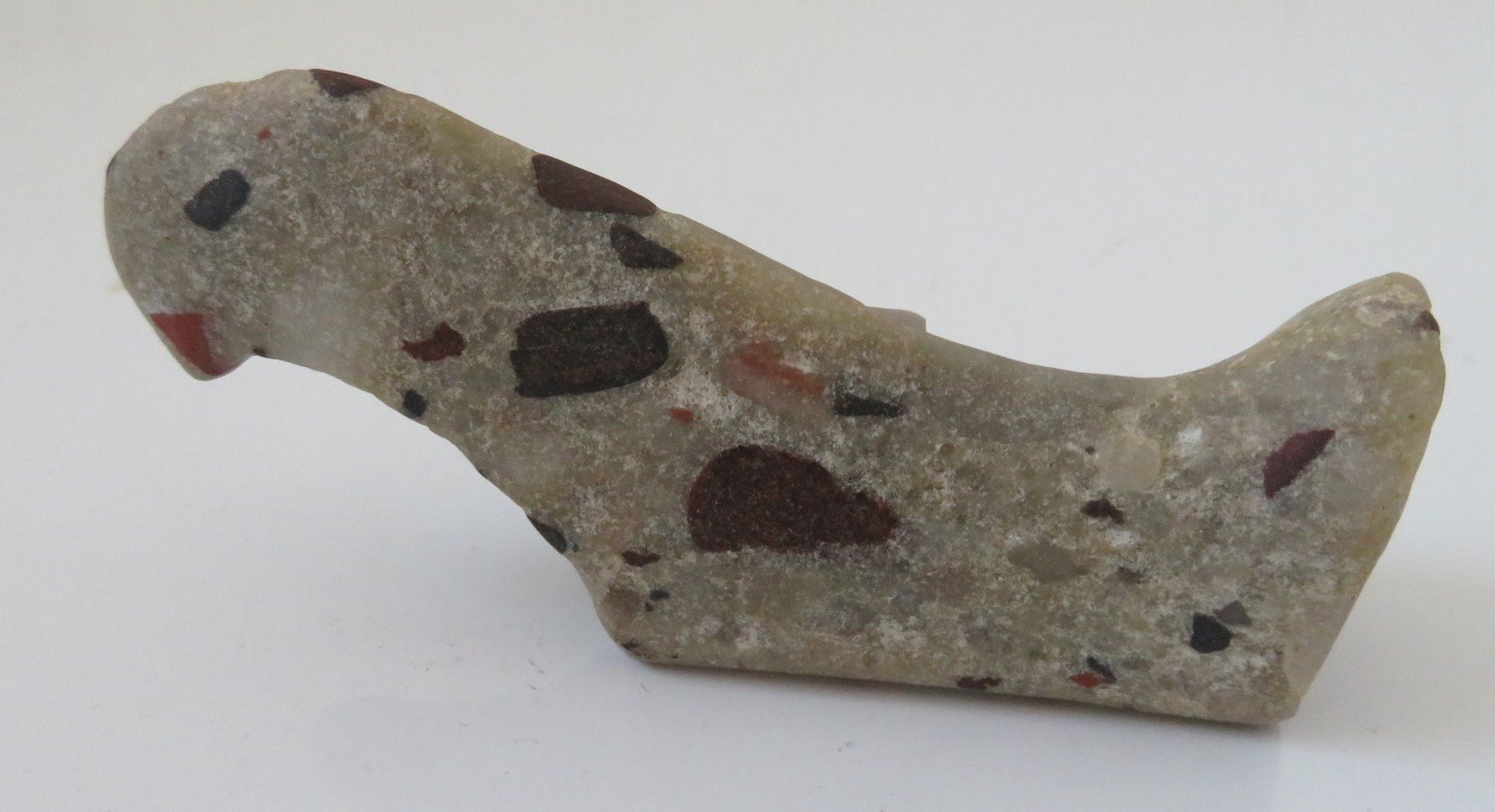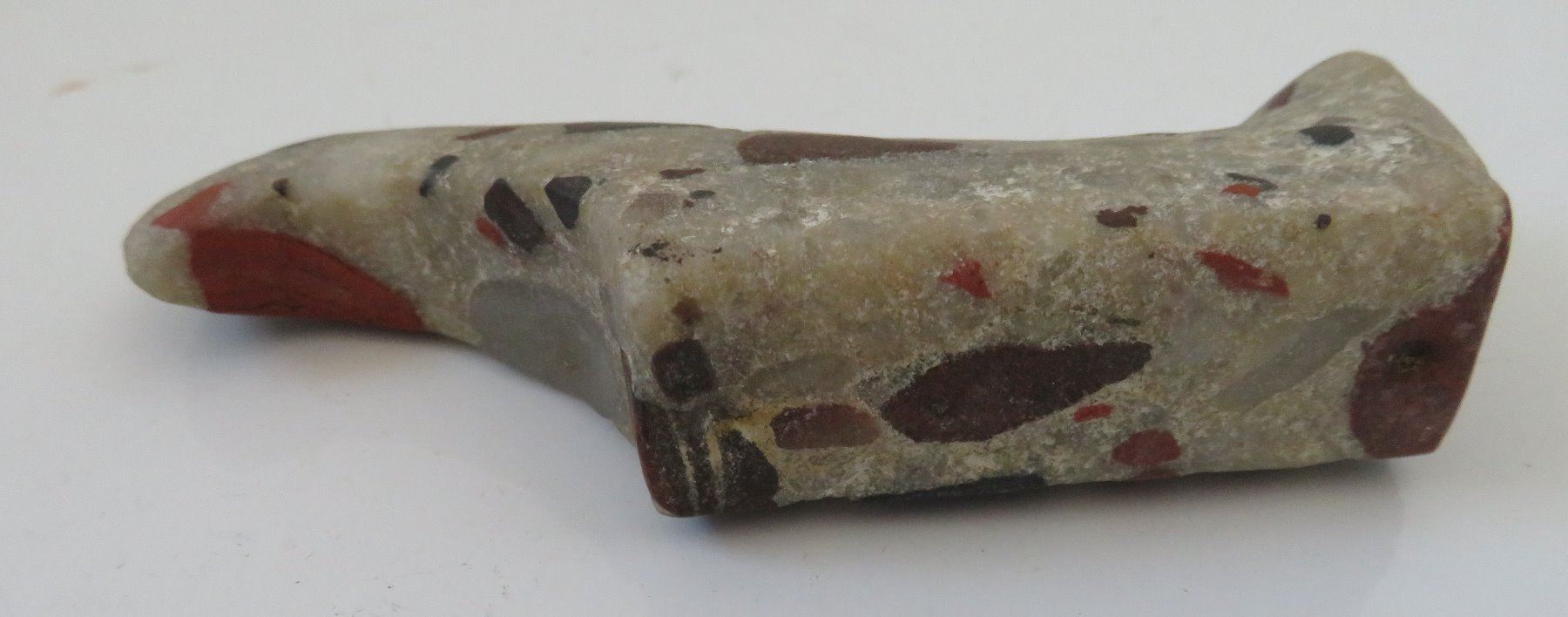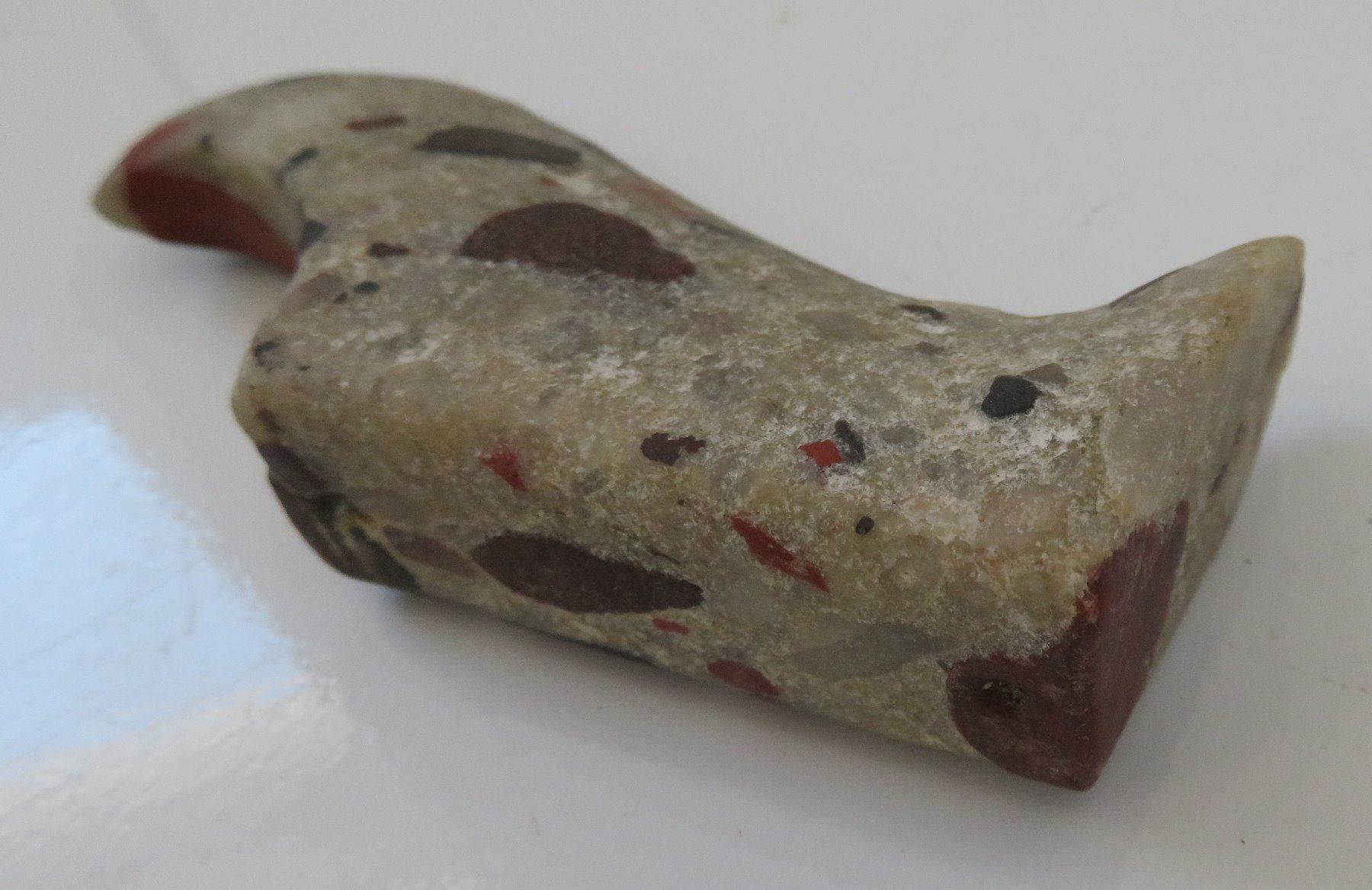 Unfinished Birdstone, historic period. Made of porphory, the item measures 4" x 2" x 1". Scioto County, Ohio. Condition: Undrilled, see images. Shipping: $20.00 w/insurance and signature.
