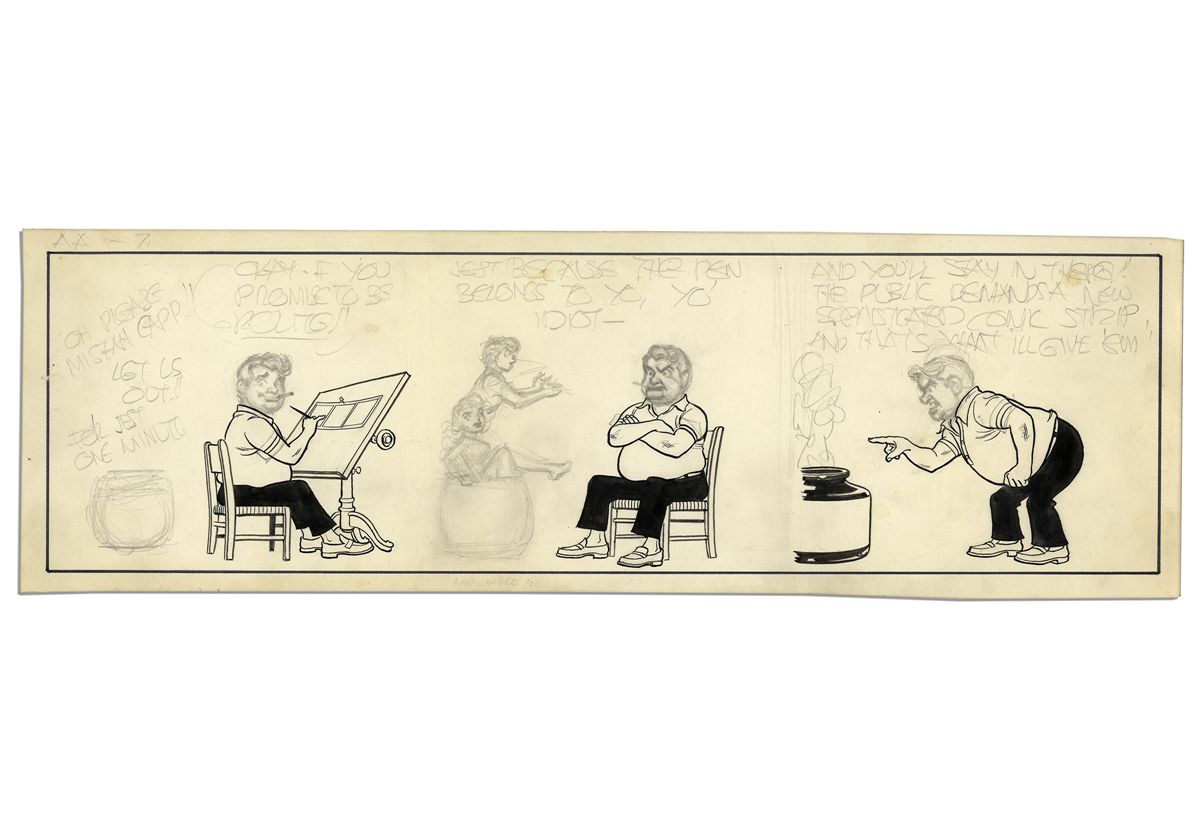 Unfinished, Undated Comic by Al Capp -- Drawn in Pencil on Both Sides With Some Ink -- Self Portrait of Capp as Cartoonist -- 19.75'' x 6.25'' -- Toning & Faint Staining, Near Fine
