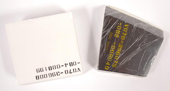 Unflown Shuttle Tiles. Lot of two different including an all-white one (4x4.25") consisting of two white tiles of different textures glued to each other. One has black Id stencilled numbers and the other, negative embossed ID numbers. The other is irregularly cut with a thick black side (yellow stencilled ID numbers) attached to a thin white side. Both are in excellent condition. ALSO, two NASA 8x10" glossy color photos (on Kodak paper) showing "Tiles that came off during the launch of STS-3". Unusual.