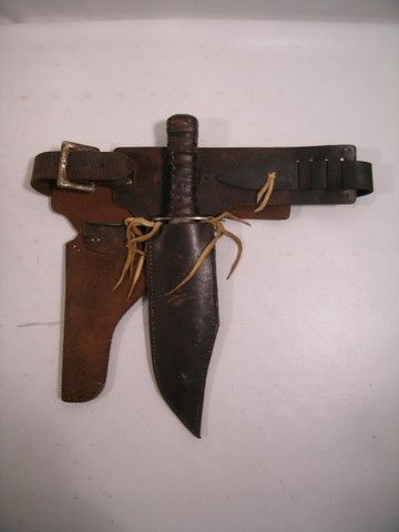 From the set of the Academy Award winning 1992 film for Best Picture, 'Unforgiven'. Starring Clint Eastwood, who also directed the film, the story is about an old west gunman who takes one last job. This prop gun belt, a background prop used in the production of the film, is made from leather, and includes a real knife, its blade dressed to look used. Oversize item. Additional postage required. (Belt measures approx. 20.5" x 9.5" x 15.25". Knife measures approx. 1.75" x 3.5" x 15")