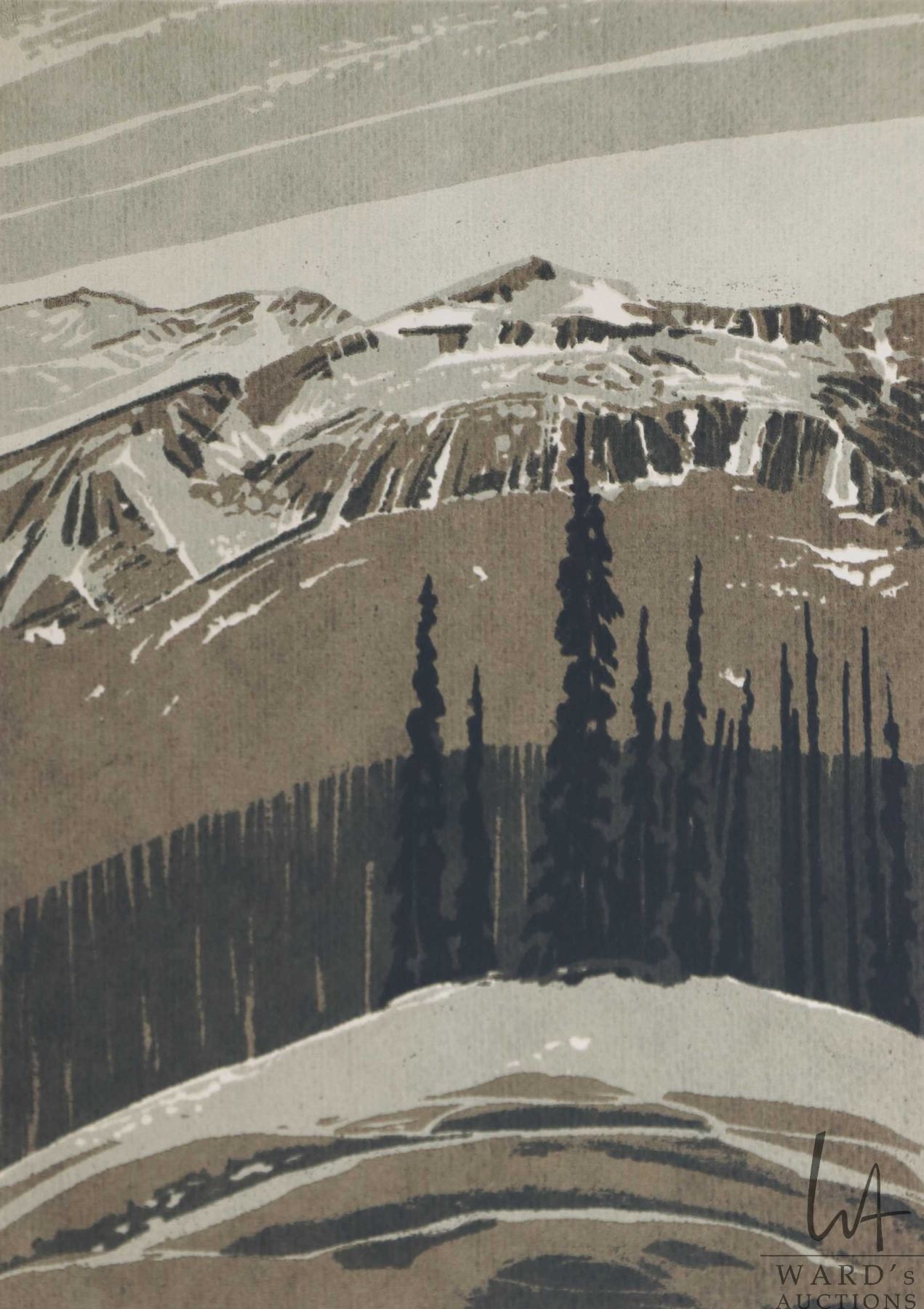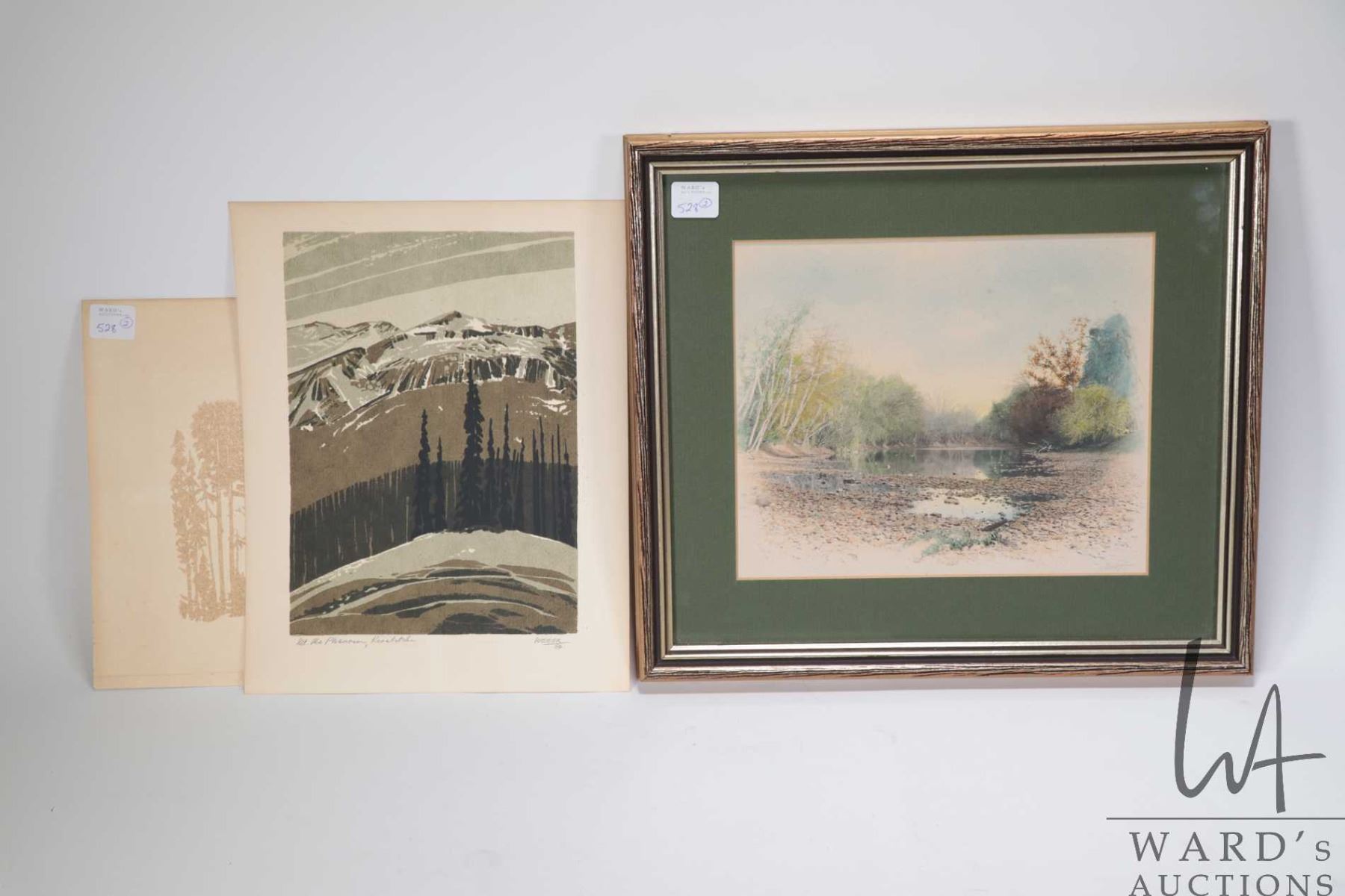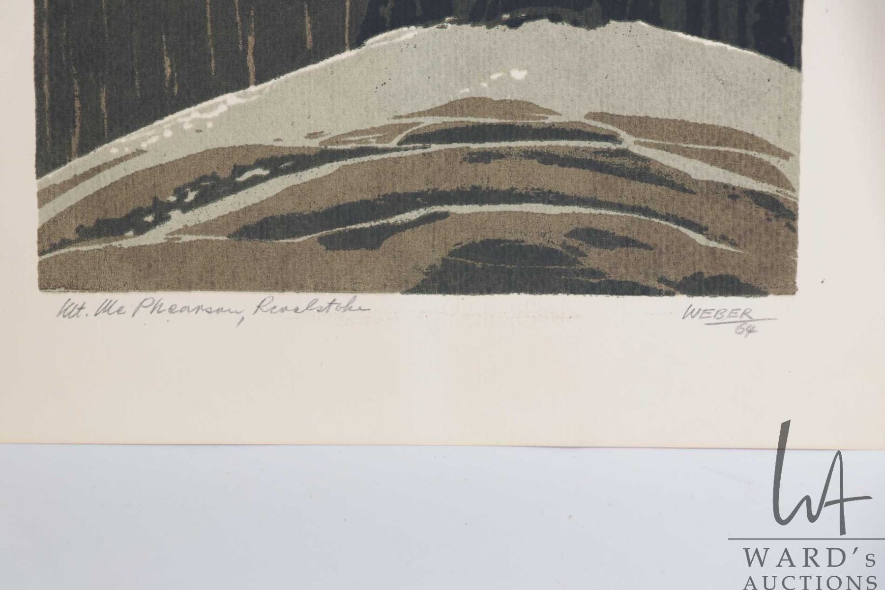 Unframed block print titled "Mount McPherson Revelstoke". Signed by artist (George) Webber 64. And a framed print of a wooded meadow.