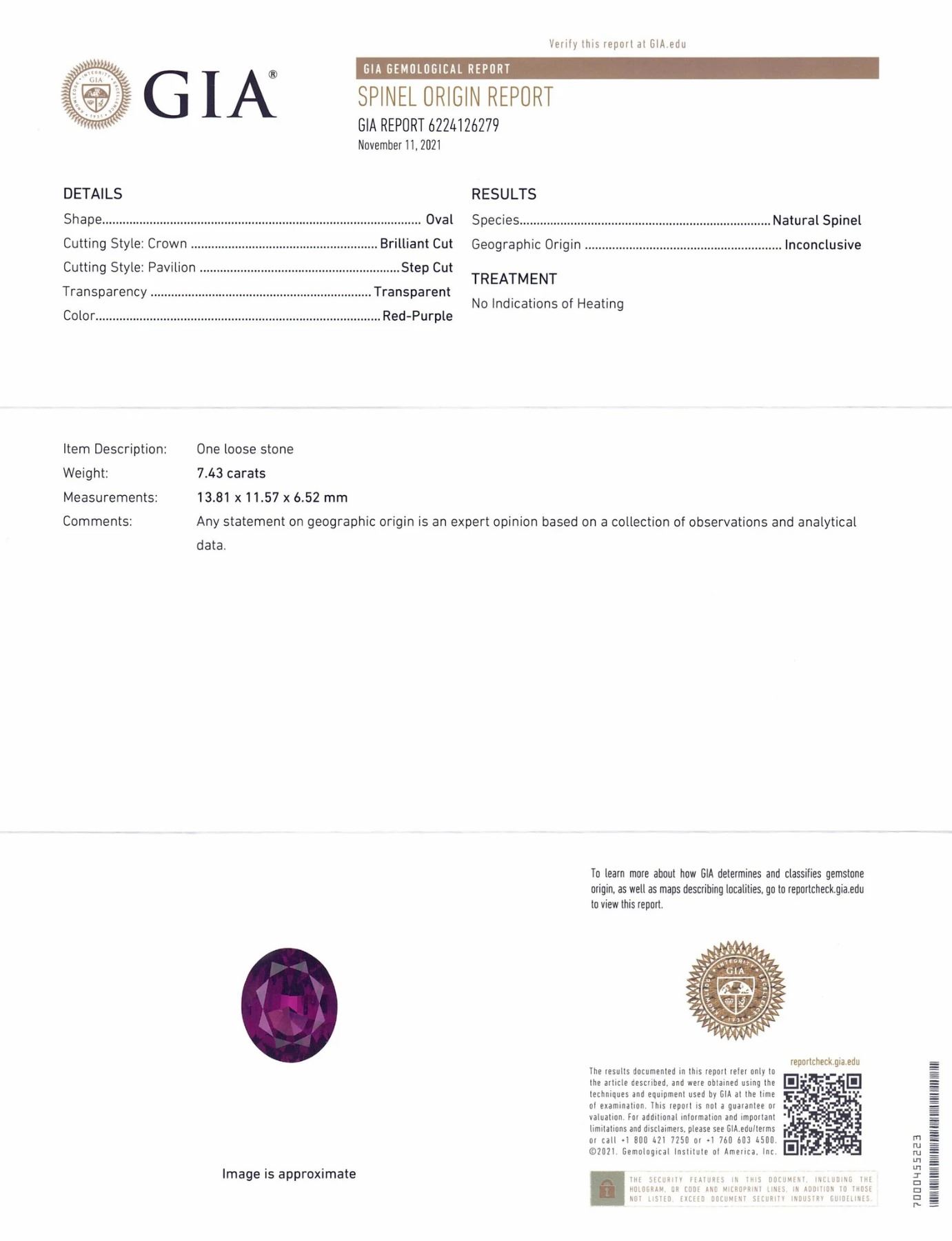 Unheated 7.43 Ct Brilliant Oval Cut Red Purple Spinel measuring 13.81 x 11.57 x 6.52 mm. This Gem has a Dazzling Red-Purple hue and a Vivid Saturation. Don't hesitate on this one!! Treatment: None. Please see the certification for additional information.