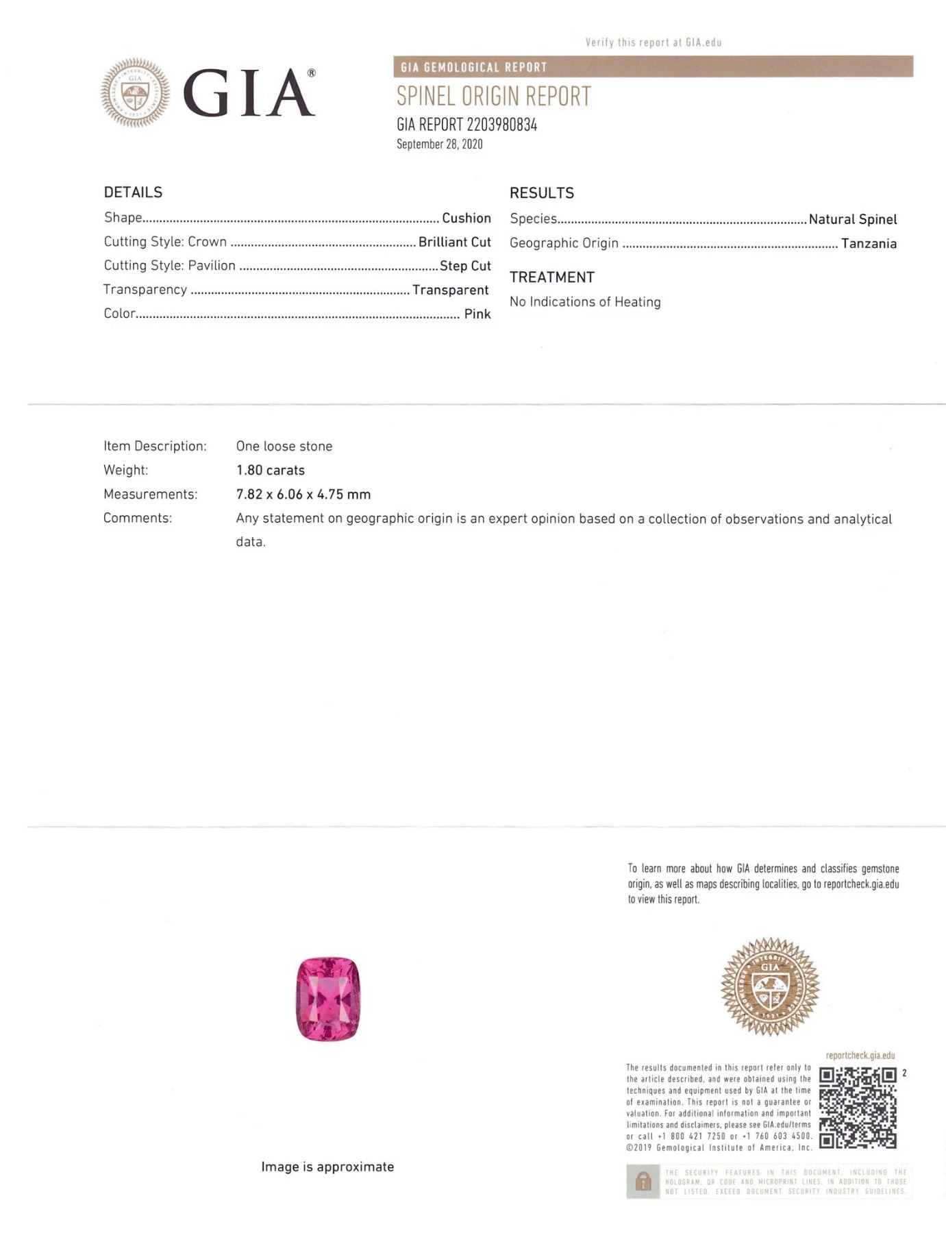 Natural Unheated Untreated 1.80 Ct Pink Mahenge Spinel is a brilliant cushion cut that measures 7.82 x 6.06 x 4.75 mm. This investment grade Spinel showcases a gorgeous color that would be a perfect piece to add to your collection!!! Origin: Tanzania. Please see the certification for further details.