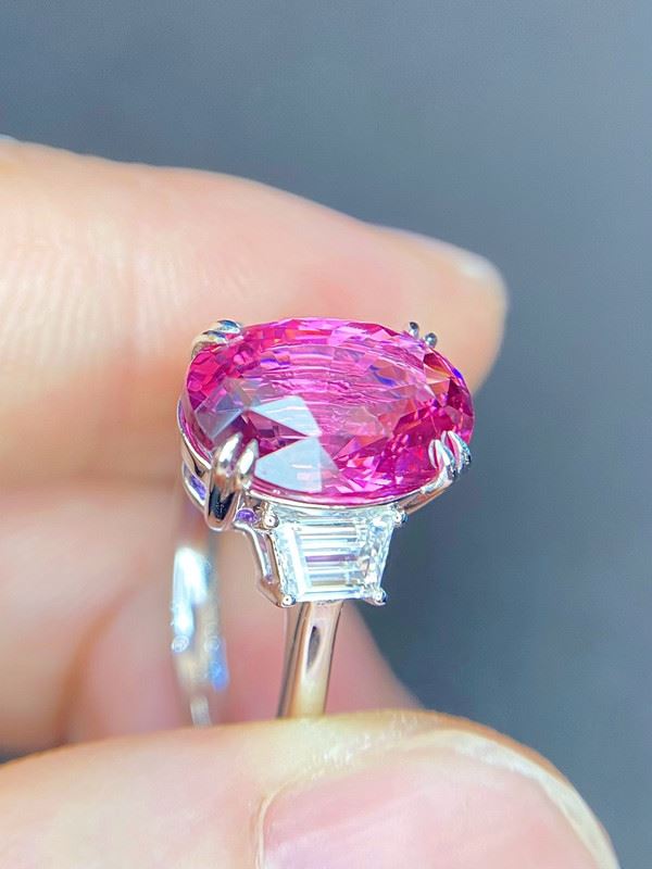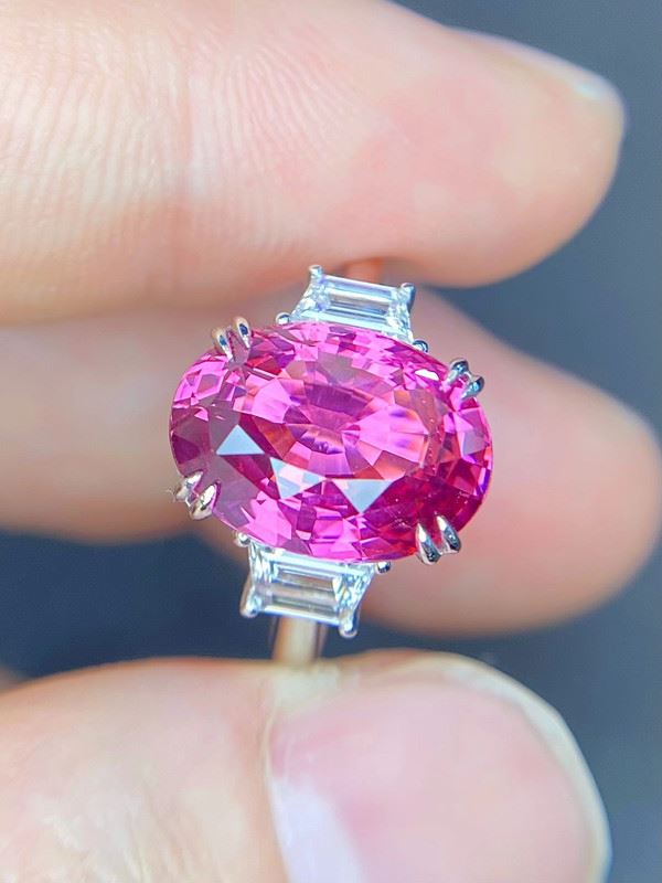 An oval, unheated hot-pink spinel takes center stage, flanked by matched tapered baguette step-cut diamonds in a timeless three-stone design—symbolizing past, present, and future. Set in white metal with crisp claw prongs, the proportions feel balanced and refined for enduring elegance.Ring size: 6, circumference: 52 mm, diameter: 16.6 mm, main Stone: 5.03ct, Side Stones: 0.527ct. Note: Comes with a GRS report.