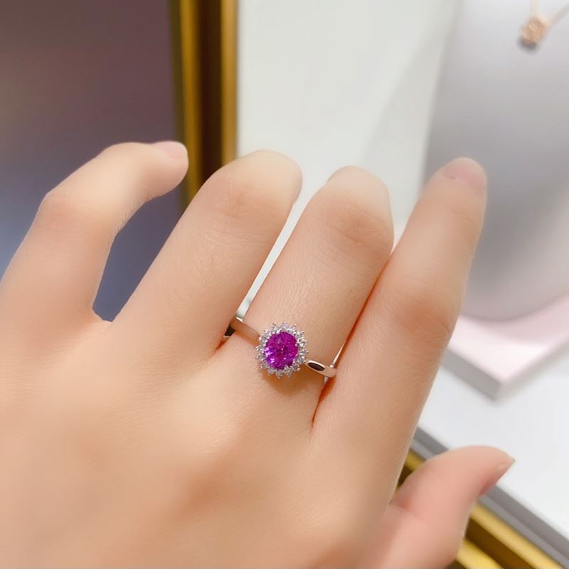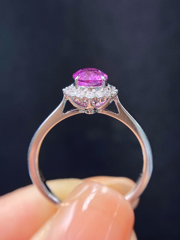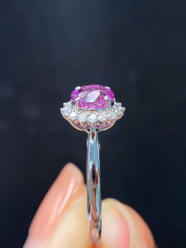 This unheated Padparadscha sapphire ring features a rare, vibrant pinkish-orange sapphire at its center, surrounded by a halo of sparkling diamonds that form a blooming flower-like design. The soft hue of the Padparadscha sapphire perfectly complements the brilliance of the diamonds, creating a luxurious yet delicate piece. This ring showcases both elegance and sophistication, making it an exquisite addition to any fine jewelry collection.Ring size: 6, circumference: 52 mm, diameter: 16.6 mm, main diamond:1.00 ct, side diamonds: 0.152 ct.Note: Comes with a GUILD certificate.