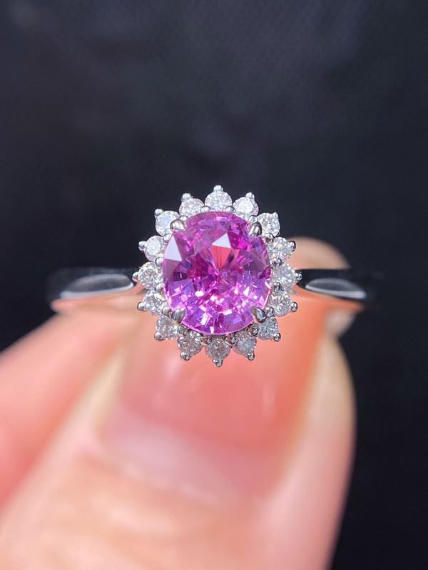 This unheated Padparadscha sapphire ring features a rare, vibrant pinkish-orange sapphire at its center, surrounded by a halo of sparkling diamonds that form a blooming flower-like design. The soft hue of the Padparadscha sapphire perfectly complements the brilliance of the diamonds, creating a luxurious yet delicate piece. This ring showcases both elegance and sophistication, making it an exquisite addition to any fine jewelry collection.Ring size: 6, circumference: 52 mm, diameter: 16.6 mm, main diamond:1.00 ct, side diamonds: 0.152 ct.Note: Comes with a GUILD certificate.
