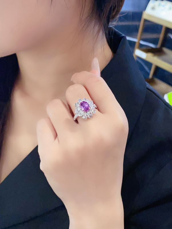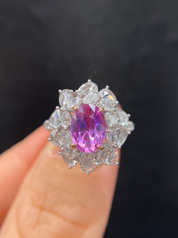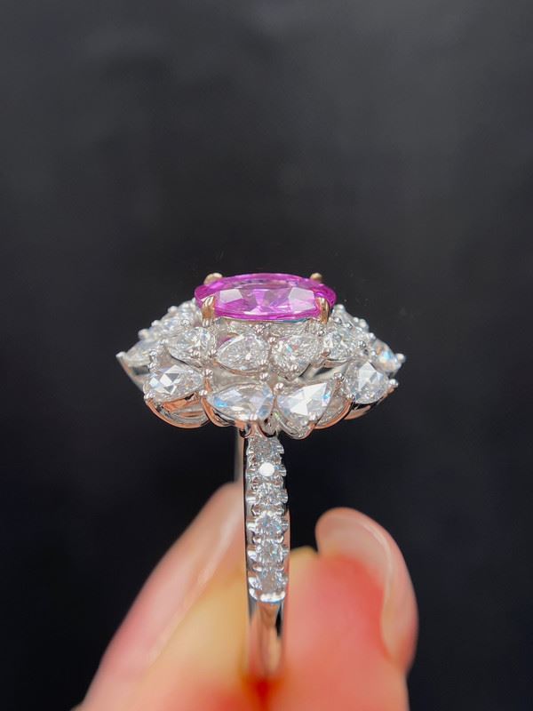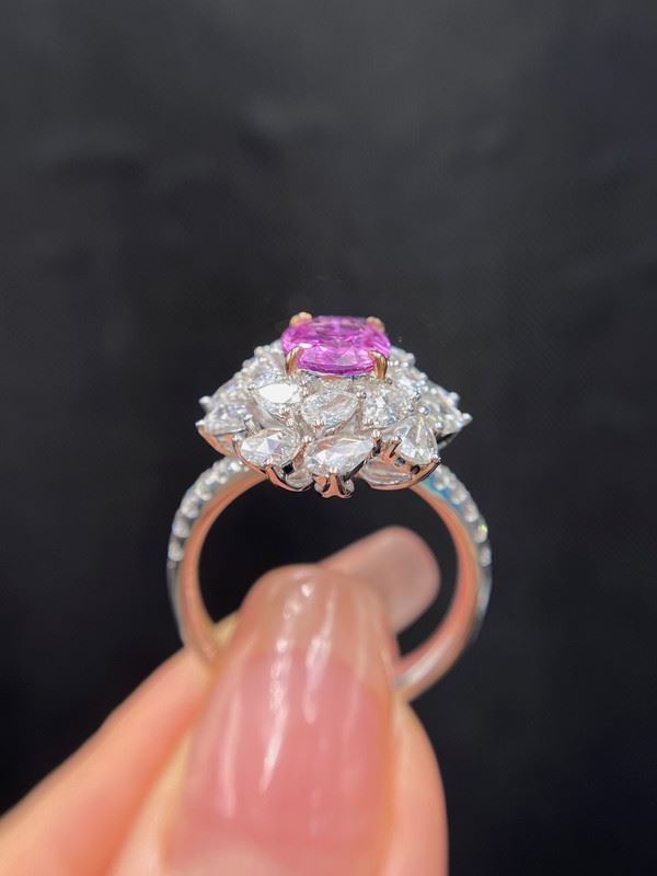 An oval, unheated pink sapphire takes center stage—bright, vivid, and crystal-clear. Pear- and round-cut white diamonds form a full French-style cluster halo, creating a lush yet airy bloom. Delicate rose-gold prongs highlight the center, set on a white-metal band for luminous contrast—an instant statement for cocktails, galas, and formal looks. Ring size: 6, circumference: 52 mm, diameter: 16.6 mm, main Stone: 1.56ct, Side Diamonds: 1.551ct. Note: Comes with a GIC certificate.