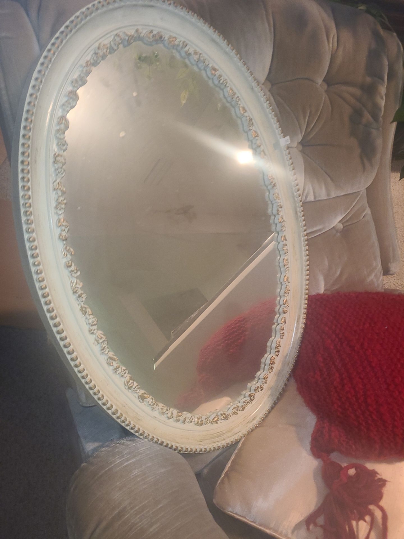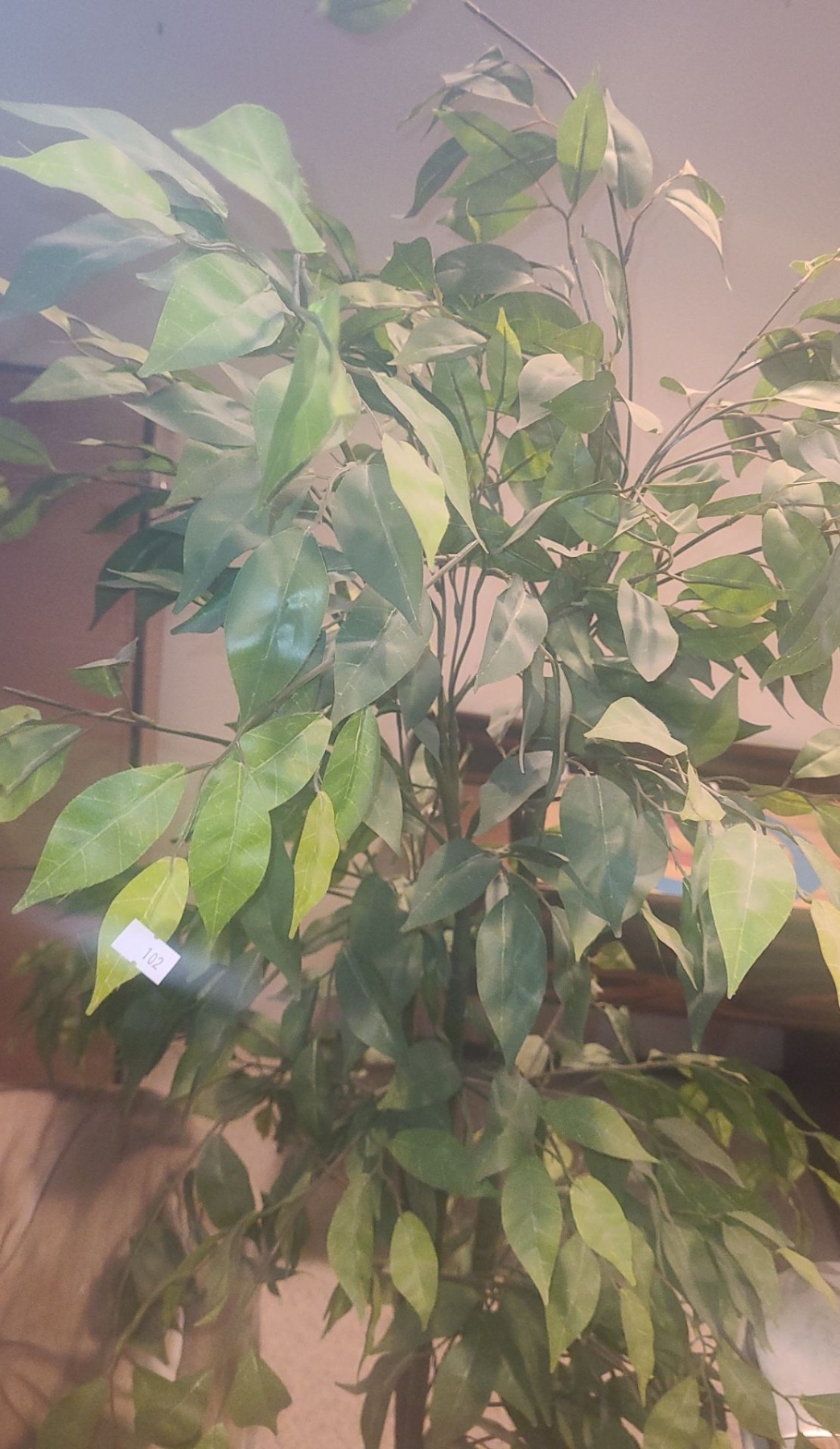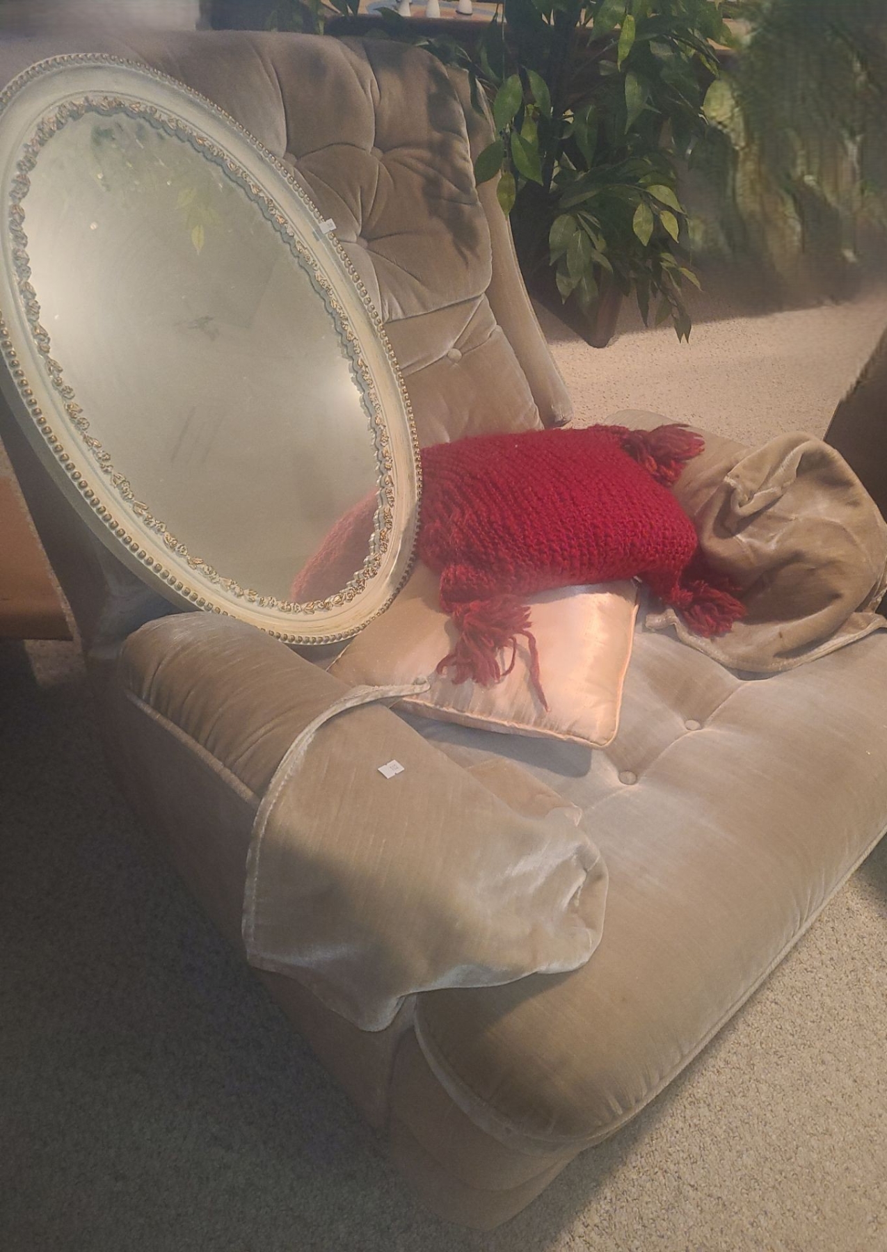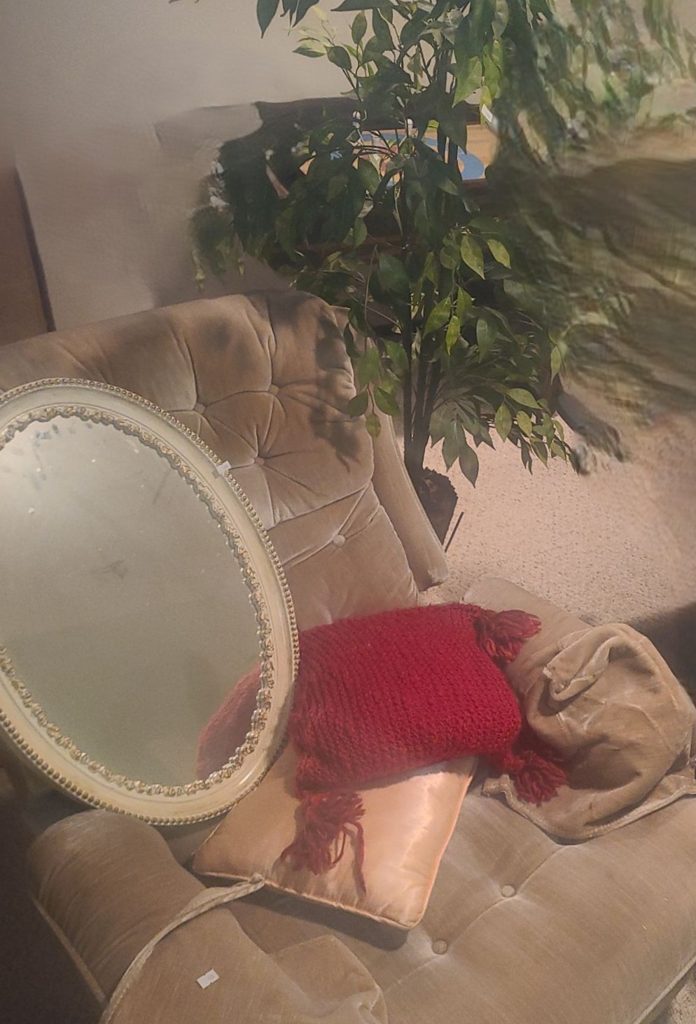 Unholstered Chair 35 W, 29 D, 36 T, Oval Mirror 18.5 x 26, Artificial Ficus Tree