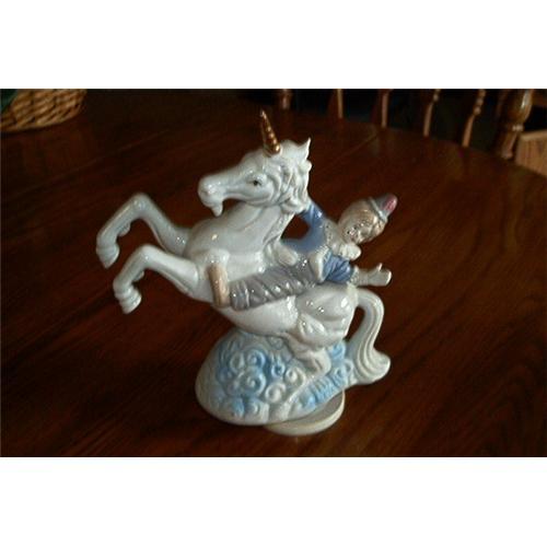 Featuring a lovely, Unicorn Music Box. The unicorn figurine moves around while the music is playing. Features a white unicorn with a gold painted horn. Also a clown setting on the back of the unicorn. Bottom has pale blue decorations. This porcelain unicorn stands in a round plastic base. Gold sticker on bottom states: Made In Taiwan. Plastic base states: Caution-Do not overwind. Still playes music. Measures 9 1/8 inches tall; base of porcelain unicorn measures 6 1/2 inches long by 3 1/2 inches wide. The plastic base has a diameter of 2 3/4 inches. Excellent condition with no chips, cracks, etc.