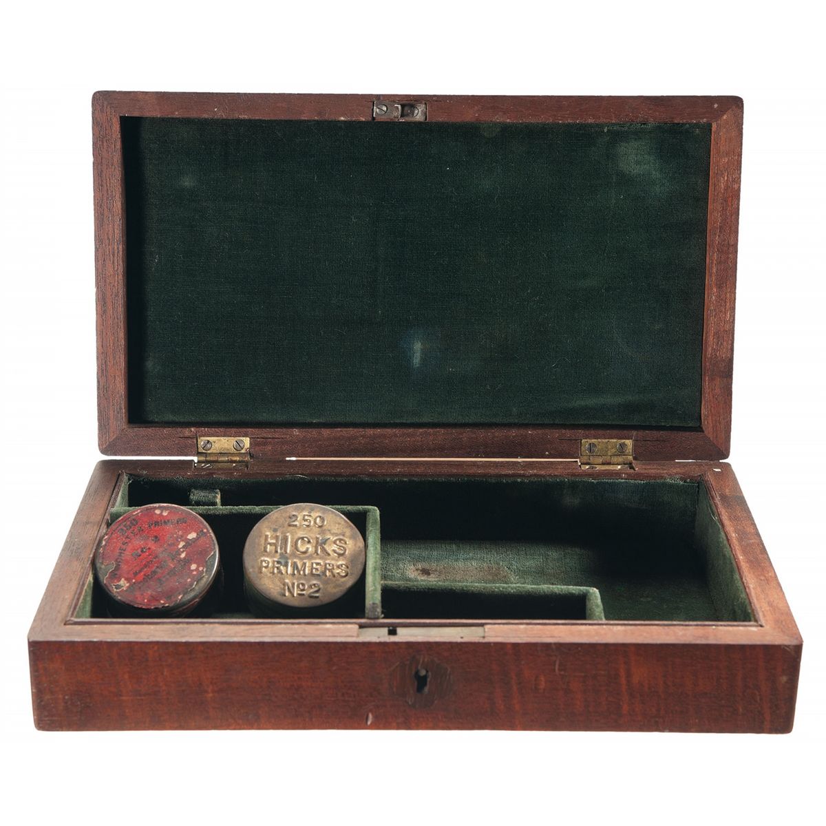 Measures 9 inches wide, 5 inches deep and 1 3/4 inches tall. The case is partitioned with three compartments and is lined in green velvet. The inside of the lid has padded green velvet and the top of the lid is without an initial plaque. Included with the case is a Hicks No. 2 primer tin, Winchester No. 2 primer tin and primers. Fitted with brass hinges and a contrasting wood lock escutcheon.
