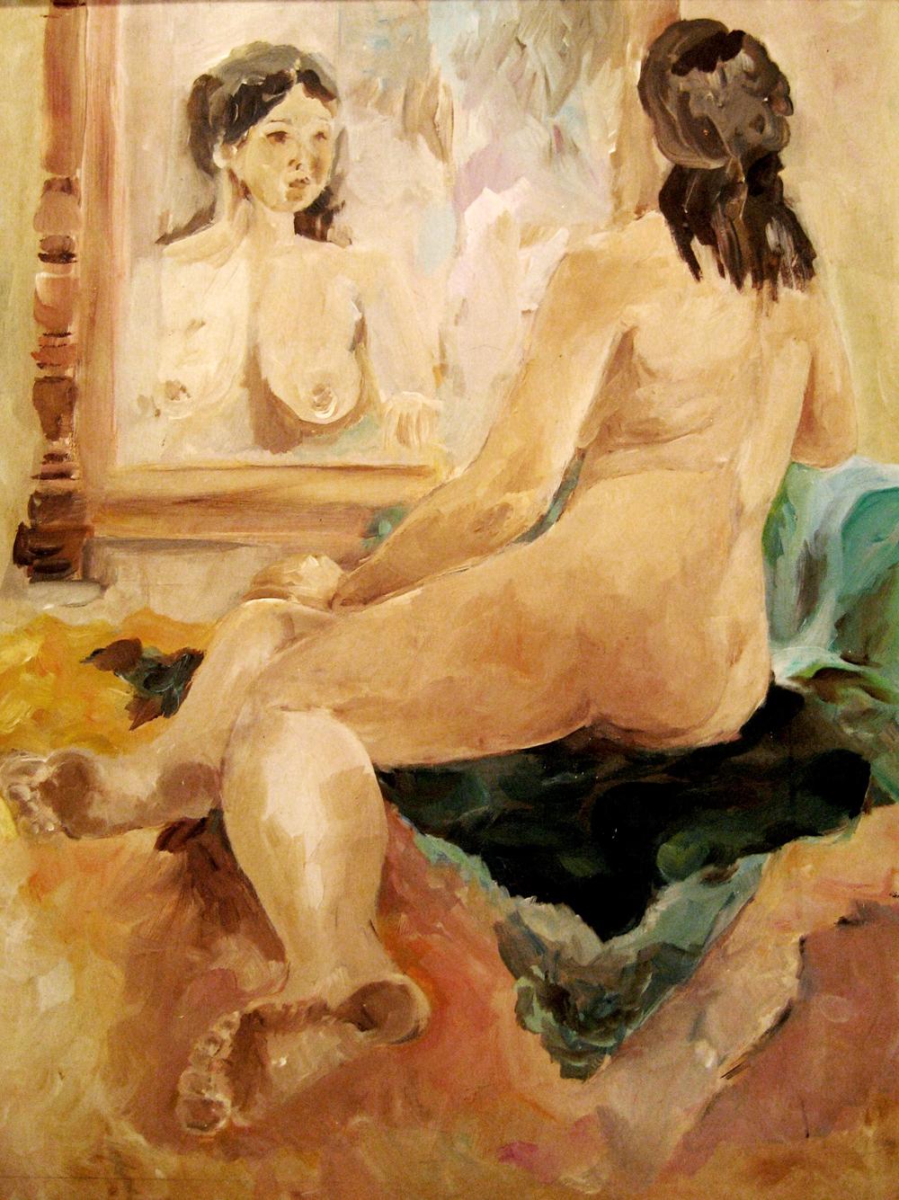 Unidentified Artist, , , Nude in front of the Mirror, Oil on masonite, 57x75cm, Signed on the reverse., , , , ,