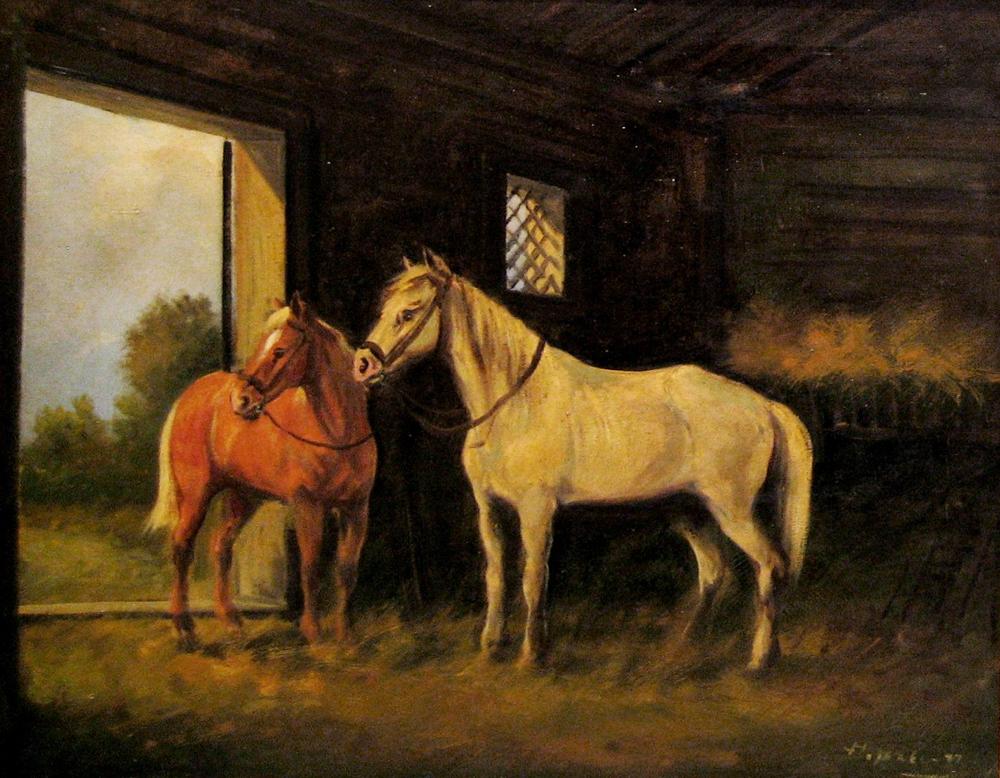 Unidentified Artist, , , Horses in the Stable, Oil on canvas, 39x49cm, Signed., , , , ,