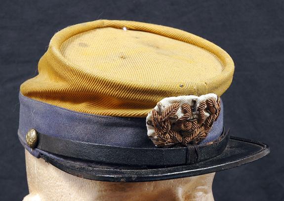 Unidentified Civil War Period Kepi. A very interesting kepi in yellow and light blue. It has a gold bullion insignia w/Unit #1and Civil War era eagle buttons. In good condition but somewhat dirty. Has had some restoration over the years in the form of a restitched visor.