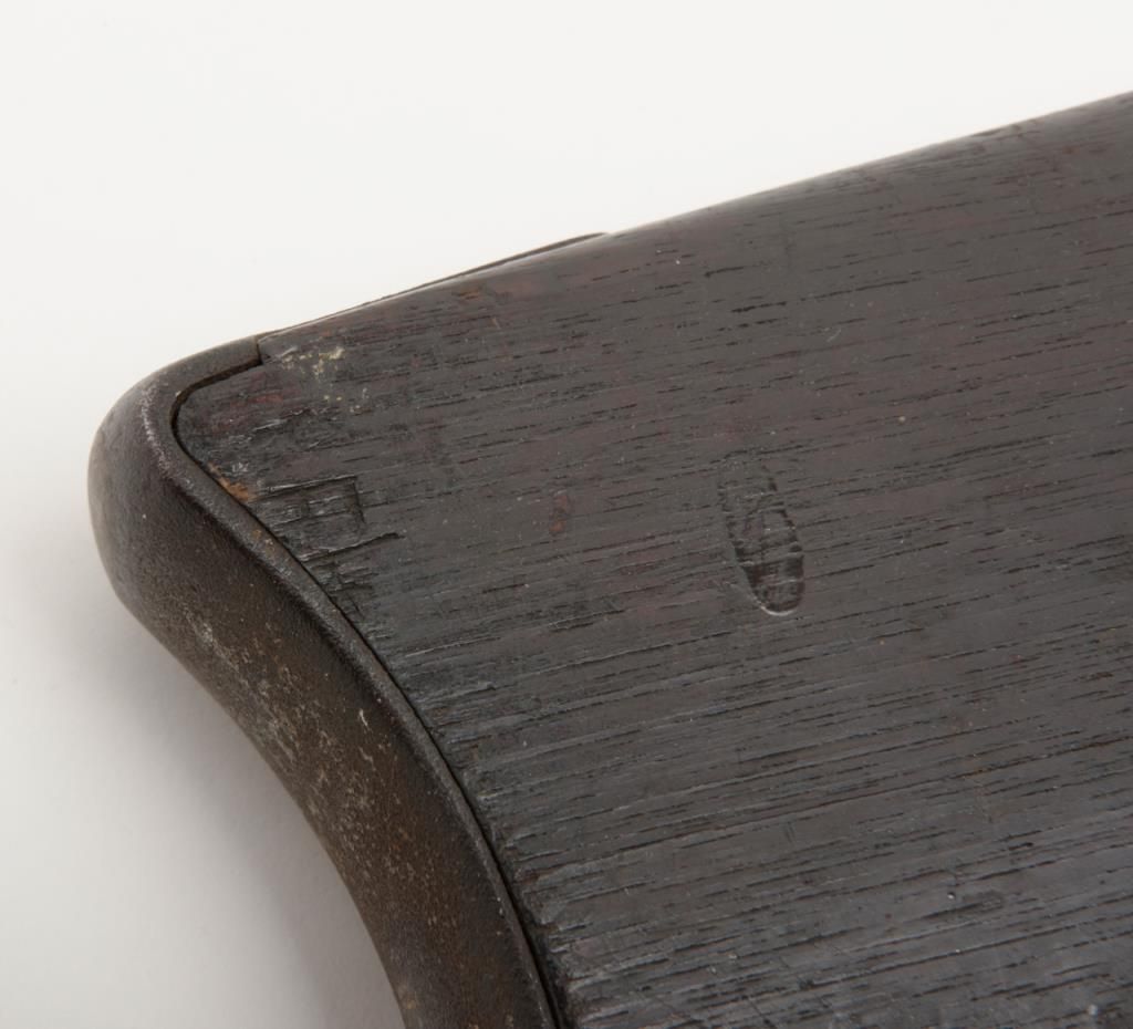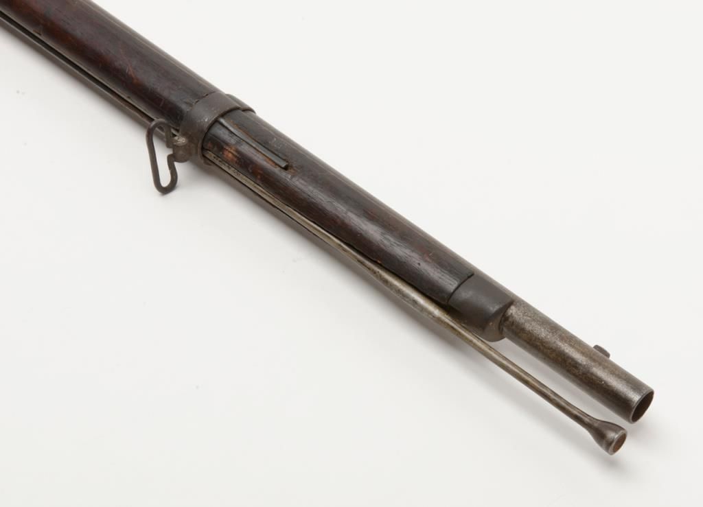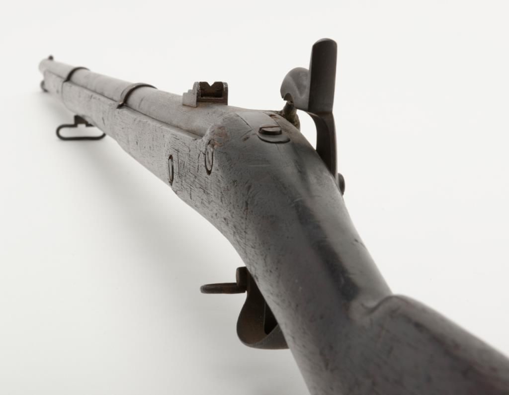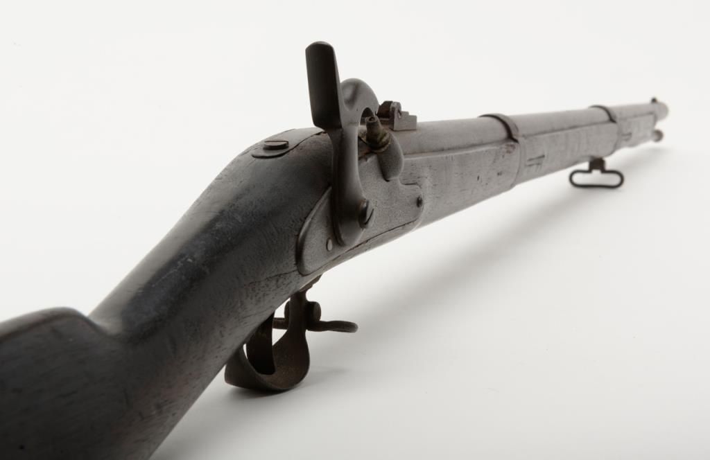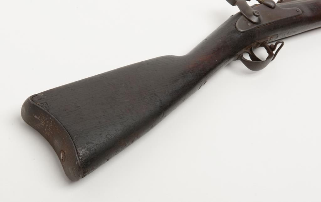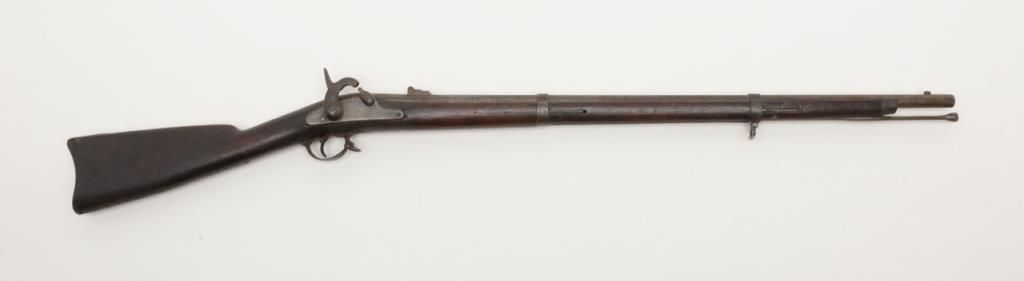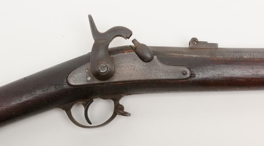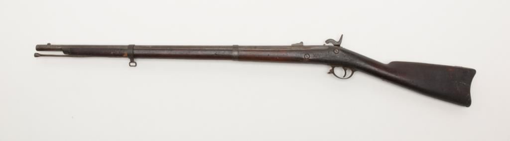 Unidentified Confederate two band percussion rifled musket patterned after U.S. Model 1861 showing 1855 style hammer attributed to unknown Confederate maker showing unusual olive shaped bolster and with date or numbers 62 at the centerportion of the lock plate and 1864 behind the hammer. The musket measures 48 ½” overall with 32” barrel and is bored out to .62 caliber smoothbore and appears to have been .58 or smaller by the thickness of the barrel.. The metal surfaces showa dark brown patina finish with scattered light to moderate pitting and erosion and some slightly heavier pitting in a few areas on the barrel and trigger guard. The stock is darkened from aging and oiling with some weathering, minor scratches,dents and imperfections but generally good. The original swivels are retained and an old ramrod is included. There is an old stamped number 35 in the wood by the butt plate on the top of the comb. Other numbers are 104 on the top of the barrel in front of rear sight and 103 on the trigger guard near the trigger bow. Both Donald E. Bryan and Bill Gary both identified this arm as Confederate but no other example or place of origin was ever determined. Bill Gary’s inventory card states