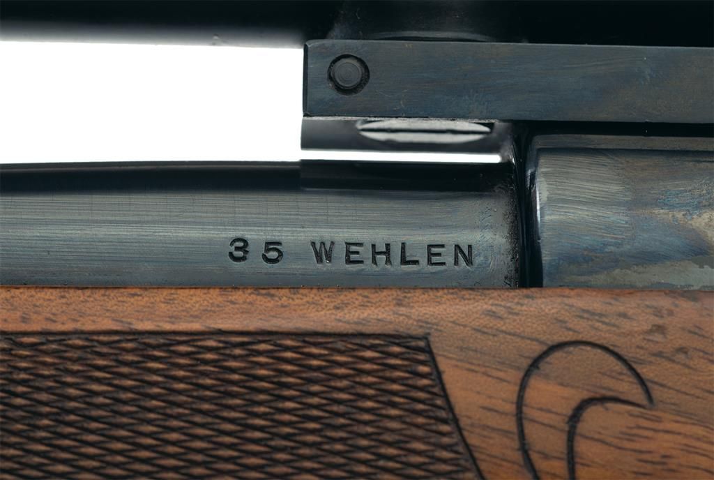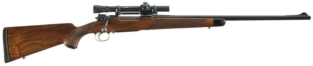 Ramp blade front sight and no fixed rear sight, with a Lyman Alaskan All-Weather 2 1/2x scope mounted on a 6 inch long Bohler rail on the receiver. The bolt has a turn-down handle, machine turned body and extractor, and a scope safety. Checkered pistol grip stock with a contrasting hardwood forearm tip, ebony grip cap, raised shadow-line cheekpiece Timney Sportsman Trigger and a ventilated Pachmayr recoil pad. Removed of stock exposed "FN" in "Oval", "1951" followed by made in Belgium on right side of receiver. Other markings on bottom of barrel include "1940", "ALB", "52", "JRB" and "CRM".
