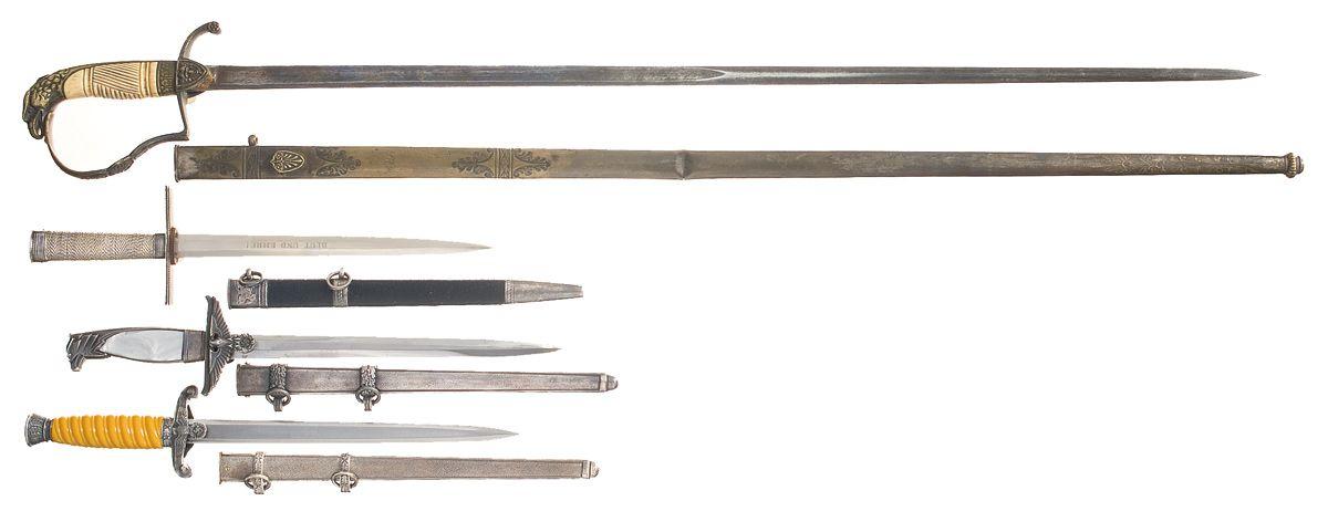 31 1/2" straight, single edged single fuller blade, with engraved designs and strong remaining niter blue and gold washed finishes. Brass hilt, with lion head languet, floral patterns on the guard and quillion, eagle head pommel and ribbed one piece bone grip. With a silver finished brass sheath. Good, with spotting on the blade and dens and a crack on the sheath where it appears to have been bent at one time. 1) Army Officer style dagger, 9 3/4" blade marked "HM", twist yellow celluloid grip, metal sheath. 2) Hitler Youth Leader style dagger, 9 1/2" blade with slogan and "M7/ 26" RZM markings, engraved guard, wire grip, logo on pommel and leather and metal sheath. 3) Diplomat Corps style dagger, 10" unmarked blade, silver hilt with mother of pearl grip, metal sheath. All are in good or better condition.