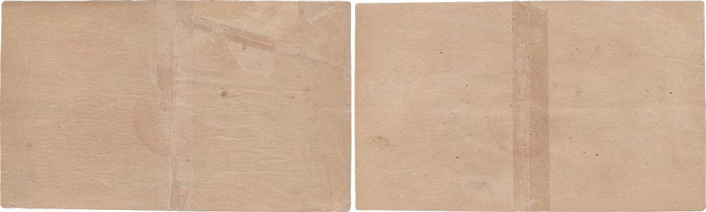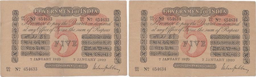 1920, 5 Rupees (2), Uniface,consecutiveserial numbers,Universalised Circle,Red Under print, Signed by MMS Gubbay,s.no.CC 95 654633 654634, (KJ RR # 2A.1.4. B.4), folded, repaired by taping two separated halves, otherwise about very fine.Note no 654633 is fully repaired at back where as in 654634 is taped at centre at the back.