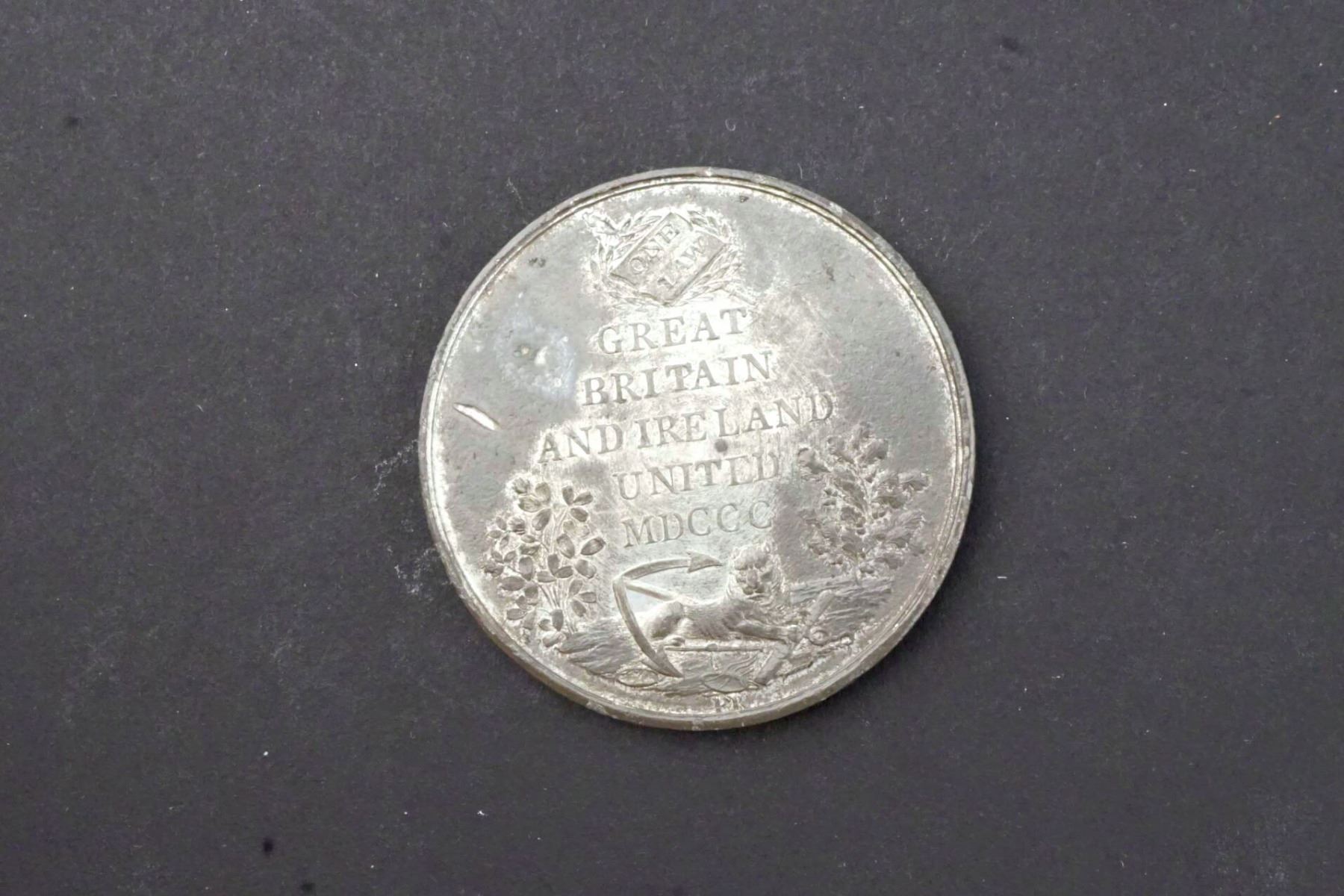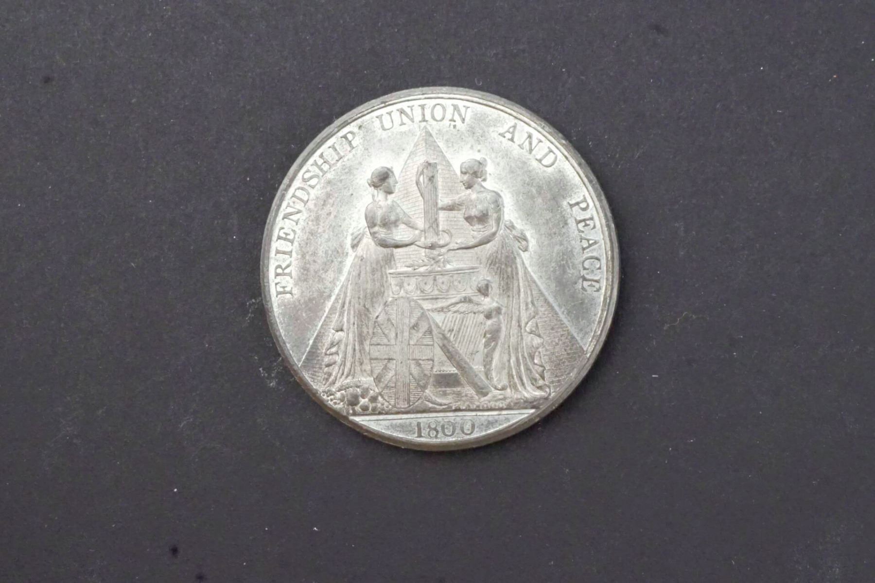 White Metal, 38 mm, 19.5 grams, FRIENDSHIP, UNION, and PEACE. Two females representing the two nation, with their respective symbols, holding a bundle of fasces with a pyramid behind. In exergue: 1800. Reverse ONE LAW in a wreath at top. GREAT BRITAIN AND IRELAND UNITED MDCCC at center. Lyon lying on anchor at bottom, greenery around.Small reverse scratch, AU/UNC.