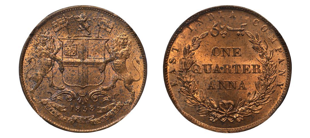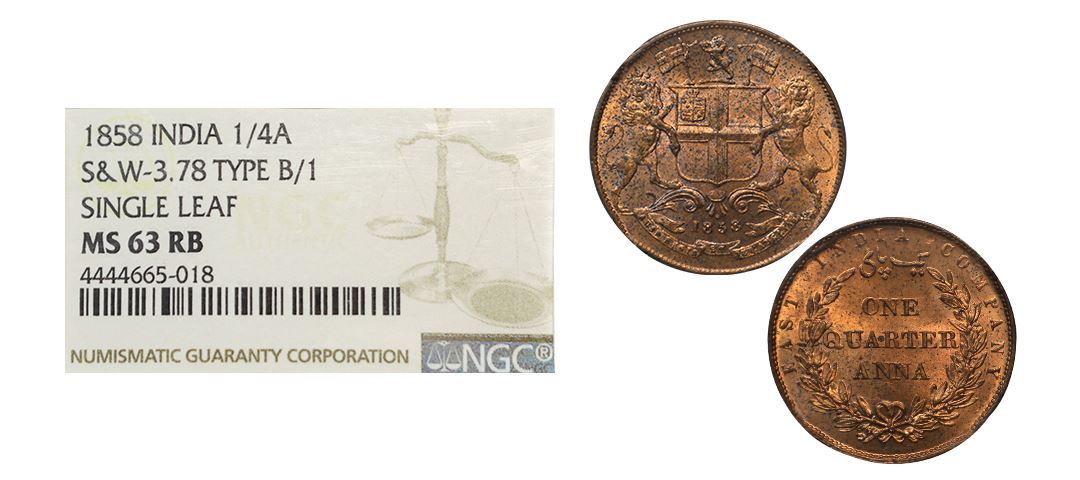 Uniform Coinage, Copper ¼ Anna, 1858, Birmingham Mint, Wreath tips-single leaves, J. Watt and Co. (Prid 156). Graded by NGC MS63RB.