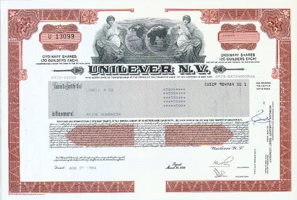 1984, Unilever NV established in Rotterdam, Netherlands, Stock certificate for 500 shares. Brown Top center vignette of two allegorical females flanking two globes. Unilever was created in 1930 by the merger of British soapmaker Lever Brothers and Dutch margarine producer Margarine Unie, a logical merger as palm oil was a major raw material for both margarines and soaps and could be imported more advantageously in larger quantities. Punch cancelled and very fine.