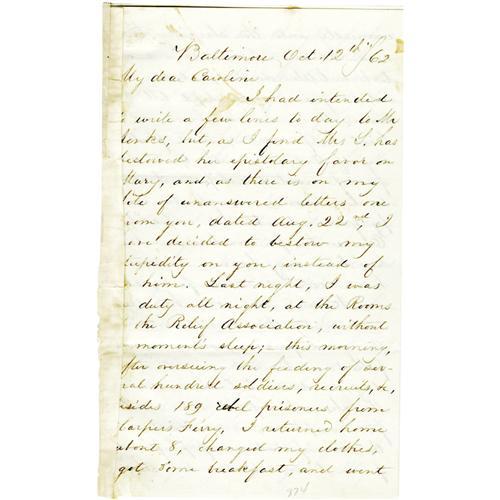 <B>[Union] A Civilian Reports on the Deplorable Condition of Soldiers, Sick and Well, in Baltimore.</B></I> Autograph Letter Signed ("S.F.S"), 8 pages, recto and verso, 5" by 7.75", Baltimore, October 12, 1862. To "Caroline." Bound with archival tape at left margin, else quite good. This long and interesting letter touches on the everyday conditions of both Rebel and Yank, stuck in Baltimore, after Antietam. In part: "<I>...This morning, after overseeing the feeding of several hundred soldiers, recruits, &, besides 189 rebel prisoners from Harper's Ferry, I returned home... and went earnestly into the sleeping business... Our work, for over two months, has been very heavy, as we have received and fed... over one hundred and sixty thousand men... The character of the men, with few exceptions, is excellent... but I am saddened at the thought of what these swarming, vigorous thousands have to endure, and how few of them, comparatively, can return... At present, my chief concern is the accommodation by night of hundreds of sick and well, who are detained here from lack of transportation, yet have no shelter provided by the government. I have seen the sidewalks, platforms and woodpiles covered at night with sleeping men, some with blankets and many without... It is growing cold, and the soldiers must suffer greatly. Last night, there were hundreds, sleeping in the open depot, and those unprovided with blankets were uncomfortable indeed. I have made a formal representation to General West, and he has promised to lay the subject before the authorities...</B></I>" From the Henry E. Luhrs Collection. Accompanied by LOA from PSA/DNA.
